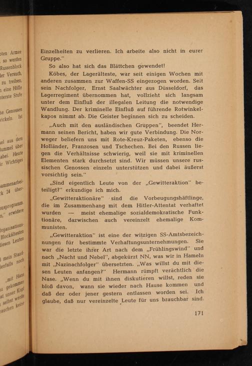 Köbes, der Lagerälteste, war seit einigen Wochen mit anderen zusammen zur Waffen- SS eingezogen worden. Seit sein Nachfolger, Ernst Saalwächter aus Düsseldorf , das Lagerregiment übernommen hat, vollzieht sich langsam unter dem Einfluß der illegalen Leitung die notwendige Wandlung. Der kriminelle Einfluß auf führende Rotwinkelkapos nimmt ab. Die Geister beginnen sich zu scheiden.