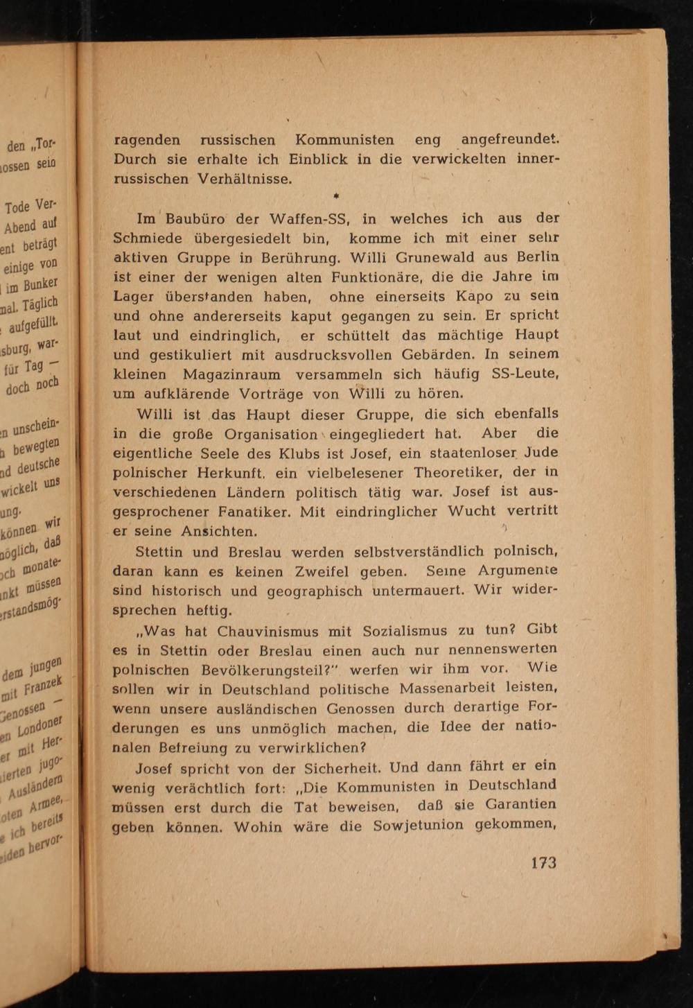 Im Baubüro der Waffen- SS , in welches ich aus der Schmiede übergesiedelt bin, komme ich mit einer sehr aktiven Gruppe in Berührung. Willi Grunewald aus Berlin ist einer der wenigen alten Funktionäre, die die Jahre im Lager überstanden haben, ohne einerseits Kapo zu sein und ohne andererseits kaput gegangen zu sein. Er spricht laut und eindringlich, er schüttelt das mächtige Haupt und gestikuliert mit ausdrucksvollen Gebärden. In seinem kleinen Magazinraum versammeln sich häufig SS - Leute, um aufklärende Vorträge von Willi zu hören.