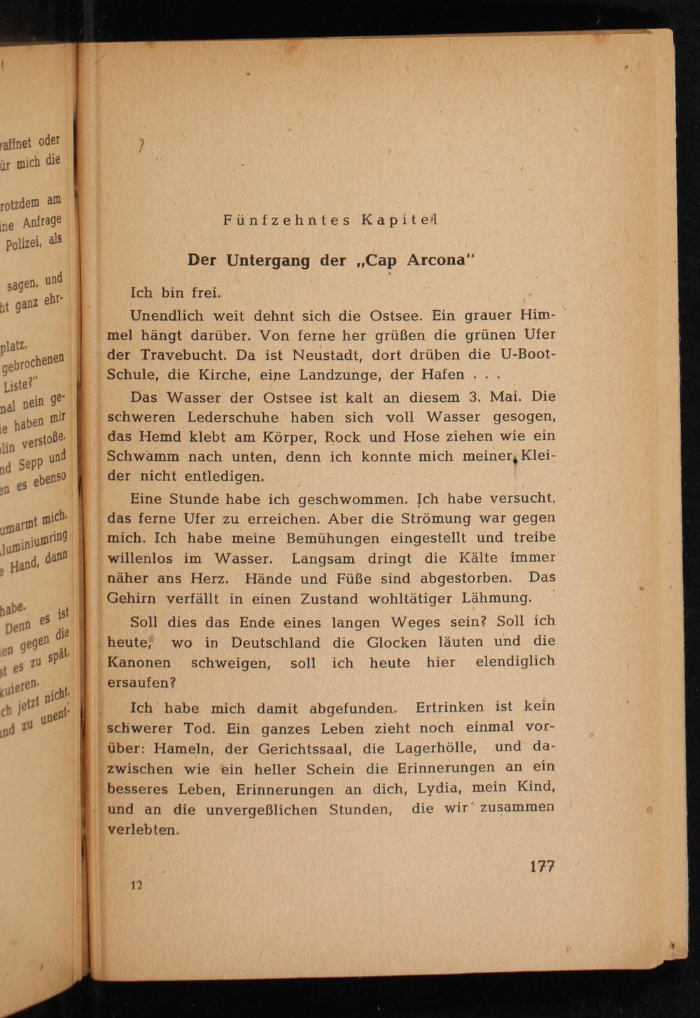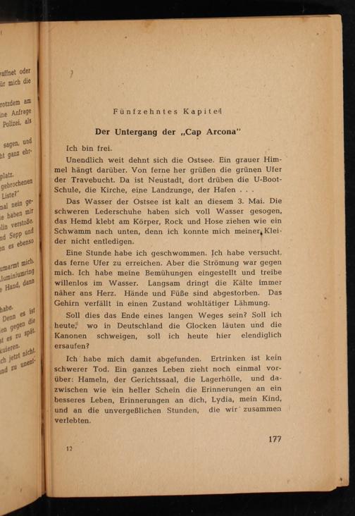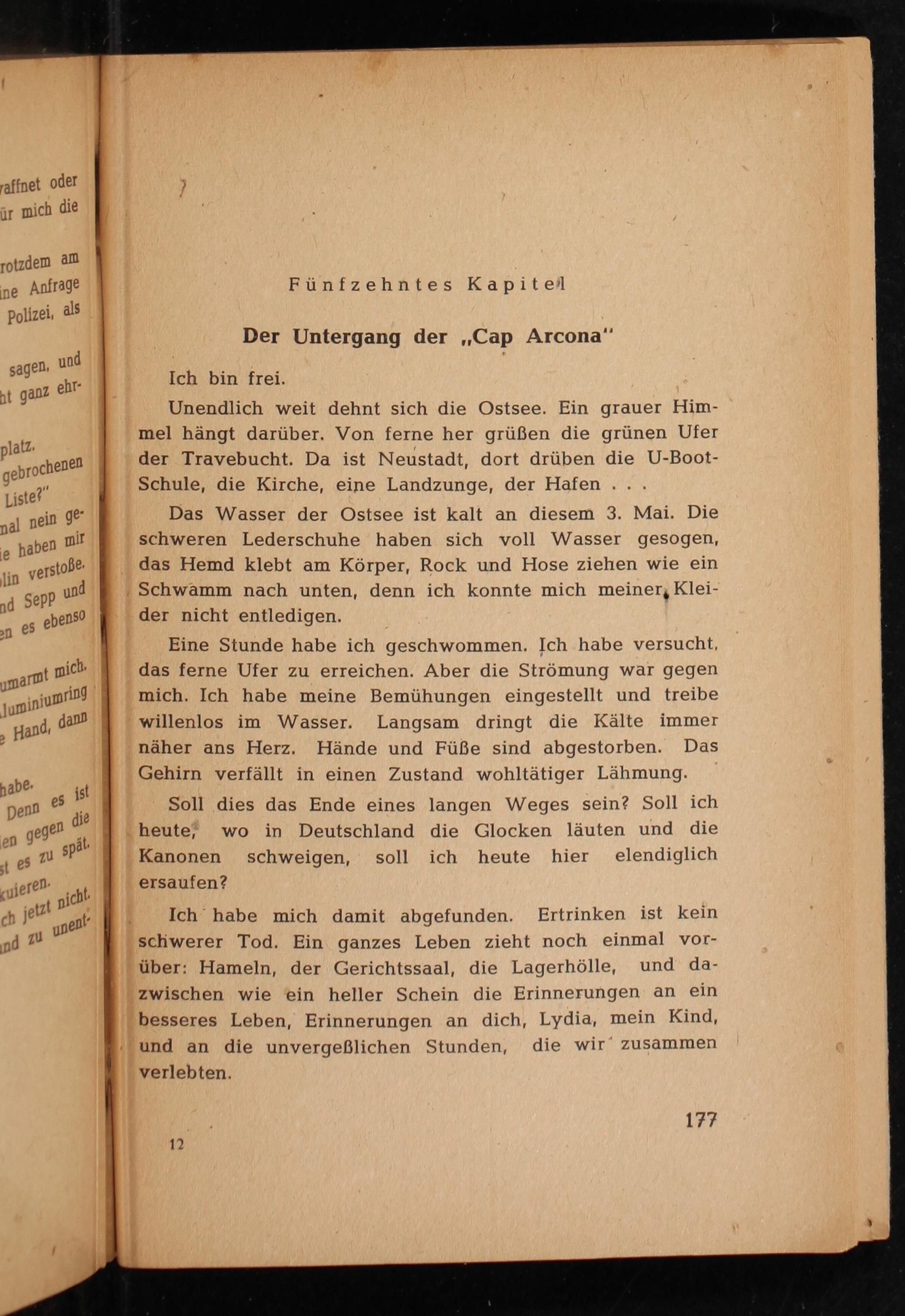 Ich habe mich damit abgefunden. Ertrinken ist kein schwerer Tod. Ein ganzes Leben zieht noch einmal vorüber: Hameln , der Gerichtssaal, die Lagerhölle, und dazwischen wie ein heller Schein die Erinnerungen an ein besseres Leben, Erinnerungen an dich, Lydia, mein Kind, und an die unvergeßlichen Stunden, die wir zusammen verlebten.