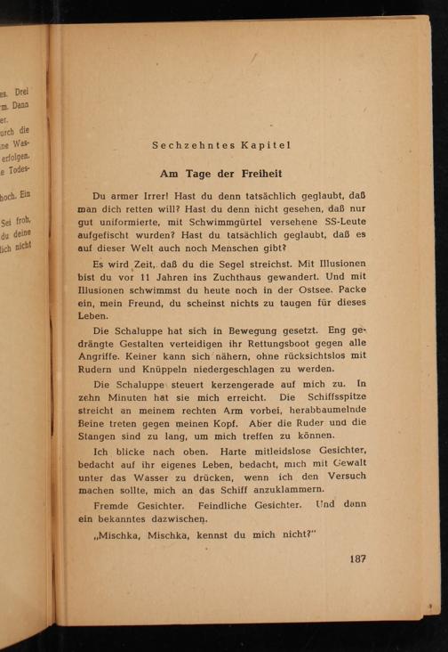 Du armer Irrer! Hast du denn tatsächlich geglaubt, daß man dich retten will? Hast, du denn nicht gesehen, daß nur gut uniformierte, mit Schwimmgürtel versehene SS -Leute aufgefischt wurden? Hast du tatsächlich geglaubt, daß es auf dieser Welt auch noch Menschen gibt?