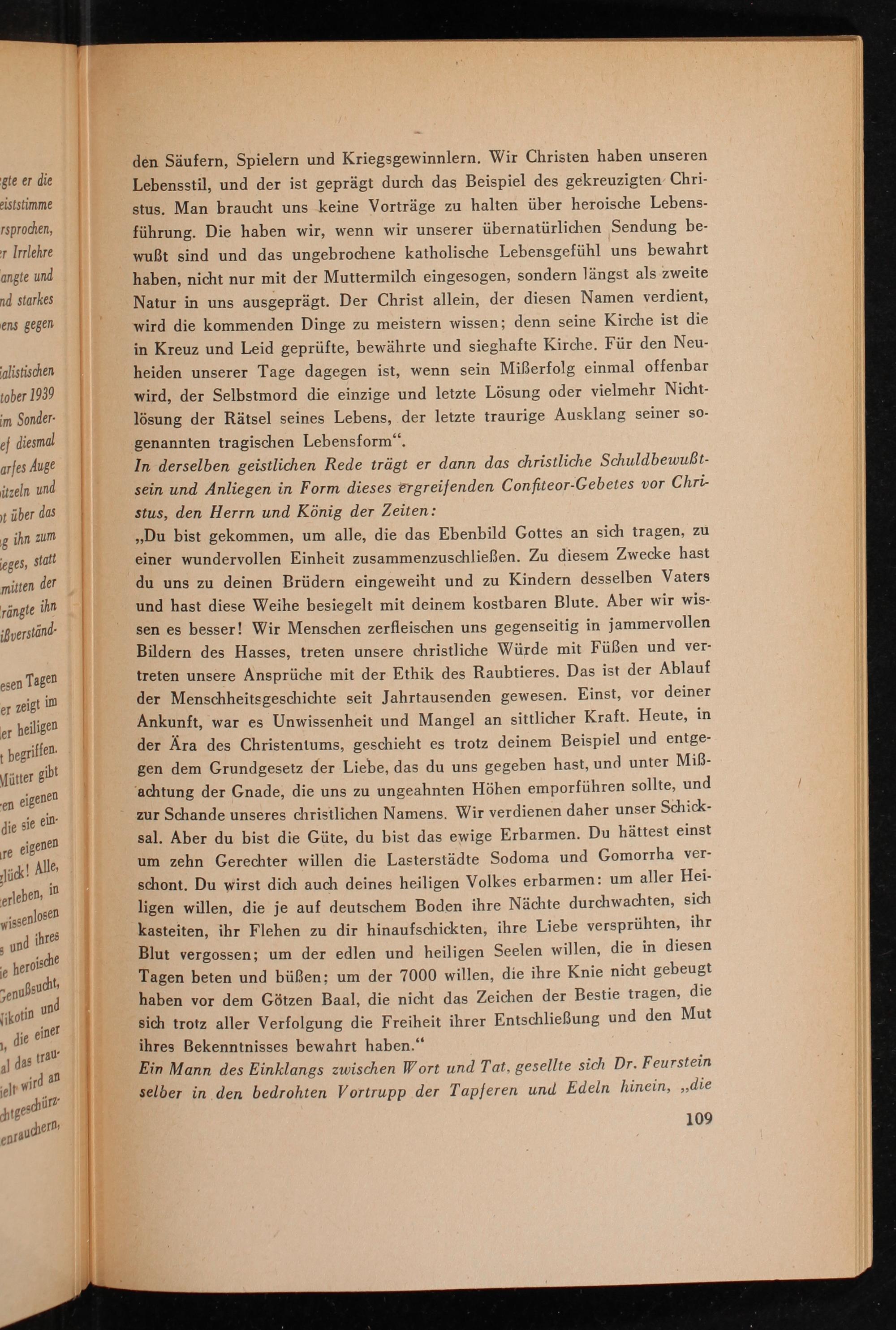 ,, Du bist gekommen, um alle, die das Ebenbild Gottes an sich tragen, zu einer wundervollen Einheit zusammenzuschließen. Zu diesem Zwecke hast du uns zu deinen Brüdern eingeweiht und zu Kindern desselben Vaters und hast diese Weihe besiegelt mit deinem kostbaren Blute. Aber wir wissen es besser! Wir Menschen zerfleischen uns gegenseitig in jammervollen Bildern des Hasses, treten unsere christliche Würde mit Füßen und vertreten unsere Ansprüche mit der Ethik des Raubtieres. Das ist der Ablauf der Menschheitsgeschichte seit Jahrtausenden gewesen. Einst, vor deiner Ankunft, war es Unwissenheit und Mangel an sittlicher Kraft. Heute, in der Ära des Christentums, geschieht es trotz deinem Beispiel und entgegen dem Grundgesetz der Liebe, das du uns gegeben hast, und unter Miẞachtung der Gnade, die uns zu ungeahnten Höhen emporführen sollte, und zur Schande unseres christlichen Namens. Wir verdienen daher unser Schicksal. Aber du bist die Güte, du bist das ewige Erbarmen. Du hättest einst um zehn Gerechter willen die Lasterstädte Sodoma und Gomorrha verschont. Du wirst dich auch deines heiligen Volkes erbarmen: um aller Heiligen willen, die je auf deutschem Boden ihre Nächte durchwachten, sich kasteiten, ihr Flehen zu dir hinaufschickten, ihre Liebe versprühten, ihr Blut vergossen; um der edlen und heiligen Seelen willen, die in diesen Tagen beten und büßen; um der 7000 willen, die ihre Knie nicht gebeugt haben vor dem Götzen Baal, die nicht das Zeichen der Bestie tragen, die sich trotz aller Verfolgung die Freiheit ihrer Entschließung und den Mut ihres Bekenntnisses bewahrt haben."