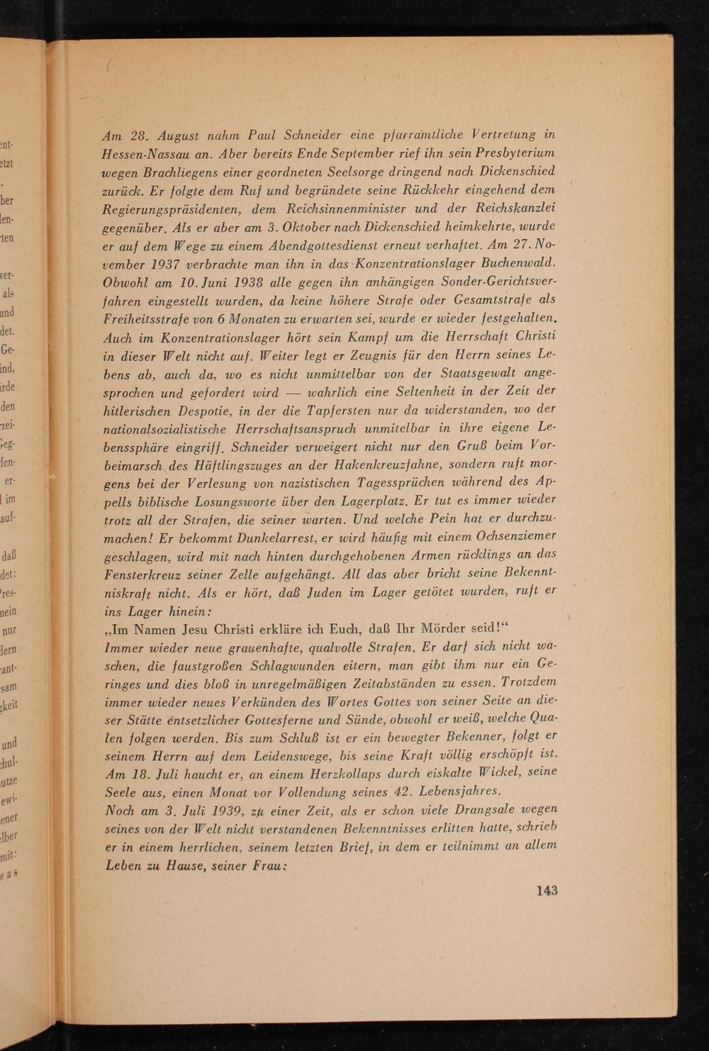 Am 28. August nahm Paul Schneider eine pfarramtliche Vertretung in Hessen- Nassau an. Aber bereits Ende September rief ihn sein Presbyterium wegen Brachliegens einer geordneten Seelsorge dringend nach Dickenschied zurück. Er folgte dem Ruf und begründete seine Rückkehr eingehend dem Regierungspräsidenten, dem Reichsinnenminister und der Reichskanzlei gegenüber. Als er aber am 3. Oktober nach Dickenschied heimkehrte, wurde er auf dem Wege zu einem Abendgottesdienst erneut verhaftet. Am 27. November 1937 verbrachte man ihn in das Konzentrationslager Buchenwald. Obwohl am 10. Juni 1938 alle gegen ihn anhängigen Sonder- Gerichtsverfahren eingestellt wurden, da keine höhere Strafe oder Gesamtstrafe als Freiheitsstrafe von 6 Monaten zu erwarten sei, wurde er wieder festgehalten. Auch im Konzentrationslager hört sein Kampf um die Herrschaft Christi in dieser Welt nicht auf. Weiter legt er Zeugnis für den Herrn seines Lebens ab, auch da, wo es nicht unmittelbar von der Staatsgewalt angesprochen und gefordert wird wahrlich eine Seltenheit in der Zeit der hitlerischen Despotie, in der die Tapfersten nur da widerstanden, wo der nationalsozialistische Herrschaftsanspruch unmitelbar in ihre eigene Lebenssphäre eingriff. Schneider verweigert nicht nur den Gruß beim Vorbeimarsch des Häftlingszuges an der Hakenkreuzfahne, sondern ruft morgens bei der Verlesung von nazistischen Tagessprüchen während des Appells biblische Losungsworte über den Lagerplatz. Er tut es immer wieder trotz all der Strafen, die seiner warten. Und welche Pein hat er durchzumachen! Er bekommt Dunkelarrest, er wird häufig mit einem Ochsenziemer geschlagen, wird mit nach hinten durchgehobenen Armen rücklings an das Fensterkreuz seiner Zelle aufgehängt. All das aber bricht seine Bekenntniskraft nicht. Als er hört, daß Juden im Lager getötet wurden, ruft er ins Lager hinein: