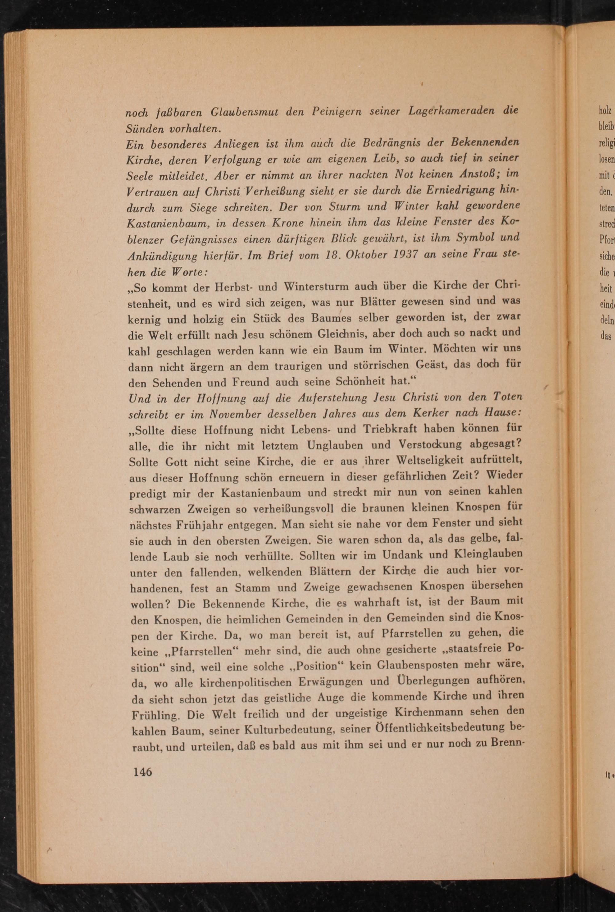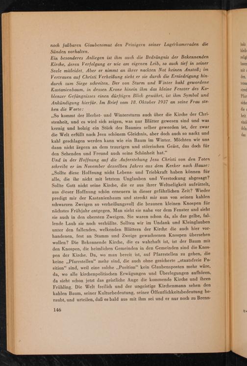 Und in der Hoffnung auf die Auferstehung Jesu Christi von den Toten schreibt er im November desselben Jahres aus dem Kerker nach Hause: ,, Sollte diese Hoffnung nicht Lebens- und Triebkraft haben können für alle, die ihr nicht mit letztem Unglauben und Verstockung abgesagt? Sollte Gott nicht seine Kirche, die er aus ihrer Weltseligkeit aufrüttelt, aus dieser Hoffnung schön erneuern in dieser gefährlichen Zeit? Wieder predigt mir der Kastanienbaum und streckt mir nun von seinen kahlen schwarzen Zweigen so verheißungsvoll die braunen kleinen Knospen für nächstes Frühjahr entgegen. Man sieht sie nahe vor dem Fenster und sieht sie auch in den obersten Zweigen. Sie waren schon da, als das gelbe, fallende Laub sie noch verhüllte. Sollten wir im Undank und Kleinglauben unter den fallenden, welkenden Blättern der Kirche die auch hier vorhandenen, fest an Stamm und Zweige gewachsenen Knospen übersehen wollen? Die Bekennende Kirche , die es wahrhaft ist, ist der Baum mit den Knospen, die heimlichen Gemeinden in den Gemeinden sind die Knospen der Kirche. Da, wo man bereit ist, auf Pfarrstellen zu gehen, die keine Pfarrstellen" mehr sind, die auch ohne gesicherte ,, staatsfreie Position" sind, weil eine solche ,, Position" kein Glaubensposten mehr wäre, da, wo alle kirchenpolitischen Erwägungen und Überlegungen aufhören, da sieht schon jetzt das geistliche Auge die kommende Kirche und ihren Frühling. Die Welt freilich und der ungeistige Kirchenmann sehen den kahlen Baum, seiner Kulturbedeutung, seiner Öffentlichkeitsbedeutung beraubt, und urteilen, daß es bald aus mit ihm sei und er nur noch zu Brenn