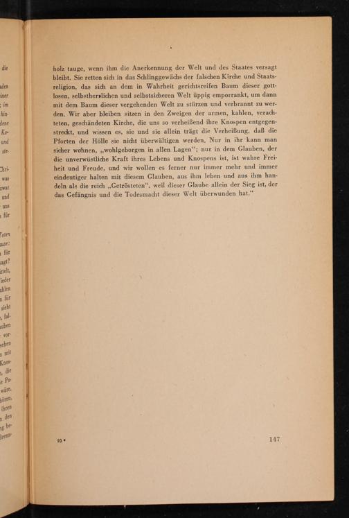 holz tauge, wenn ihm die Anerkennung der Welt und des Staates versagt bleibt. Sie retten sich in das Schlinggewächs der falschen Kirche und Staats- religion, das sich an dem in Wahrheit gerichtsreifen Baum dieser gott- losen, selbstherrlichen und selbstsicheren Welt üppig emporrankt, um dann mit dem Baum dieser vergehenden Welt zu stürzen und verbrannt zu wer- den. Wir aber bleiben sitzen in den Zweigen der armen, kahlen, verach- teten, geschändeten Kirche, die uns so verheißend ihre Knospen entgegen- streckt, und wissen es, sie und sie allein trägt die Verheißung, daß die Pforten der Hölle sie nicht überwältigen werden. Nur in ihr'kann man sicher wohnen,„wohlgeborgen in allen Lagen“; nur in dem Glauben, der die unverwüstliche Kraft ihres Lebens und Knospens ist, ist wahre Frei- heit und Freude, und wir wollen es ferner nur immer mehr und immer eindeutiger halten mit diesem Glauben, aus ihm leben und aus ihm han- deln als die reich„Getrösteten“, weil dieser Glaube allein der Sieg ist, der das Gefängnis und die Todesmacht dieser Welt überwunden Hate