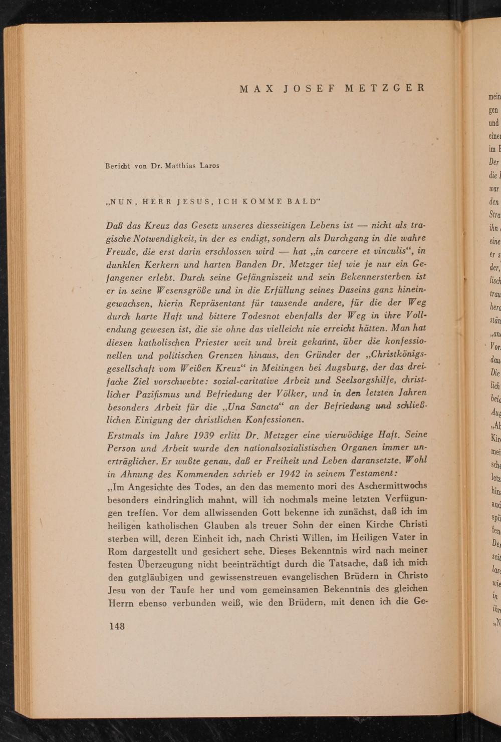 Daß das Kreuz das Gesetz unseres diesseitigen Lebens ist nicht als tragische Notwendigkeit, in der es endigt, sondern als Durchgang in die wahre Freude, die erst darin erschlossen wird hat ,, in carcere et vinculis", in dunklen Kerkern und harten Banden Dr. Metzger tief wie je nur ein Gefangener erlebt. Durch seine Gefängniszeit und sein Bekennersterben ist er in seine Wesensgröße und in die Erfüllung seines Daseins ganz hineingewachsen, hierin Repräsentant für tausende andere, für die der Weg durch harte Haft und bittere Todesnot ebenfalls der Weg in ihre Vollendung gewesen ist, die sie ohne das vielleicht nie erreicht hätten. Man hat diesen katholischen Priester weit und breit gekannt, über die konfessionellen und politischen Grenzen hinaus, den Gründer der„ ,, Christkönigsgesellschaft vom Weißen Kreuz" in Meitingen bei Augsburg , der das dreifache Ziel vorschwebte: sozial- caritative Arbeit und Seelsorgshilfe, christlicher Pazifismus und Befriedung der Völker, und in den letzten Jahren besonders Arbeit für die ,, Una Sancta" an der Befriedung und schließlichen Einigung der christlichen Konfessionen.