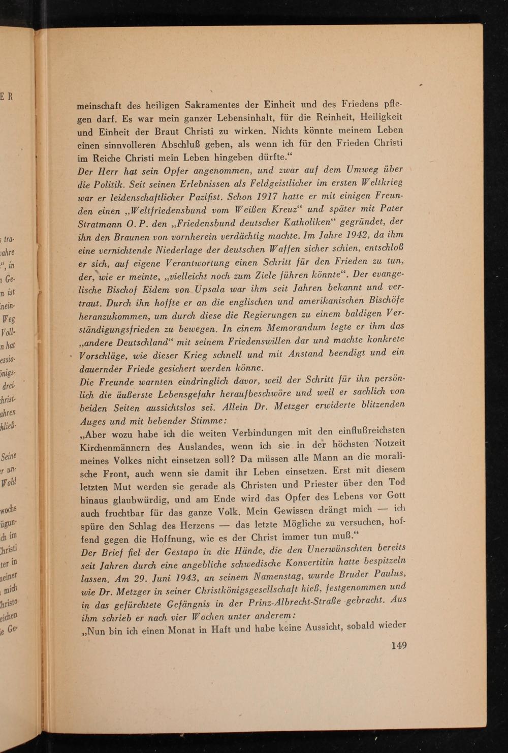 Der Brief fiel der Gestapo in die Hände, die den Unerwünschten bereits seit Jahren durch eine angebliche schwedische Konvertitin hatte bespitzeln lassen. Am 29. Juni 1943, an seinem Namenstag, wurde Bruder Paulus, wie Dr. Metzger in seiner Christkönigsgesellschaft hieß, festgenommen und in das gefürchtete Gefängnis in der Prinz-Albrecht-Straße ‚gebracht. Aus ihm schrieb er nach vier Wochen unter anderem: