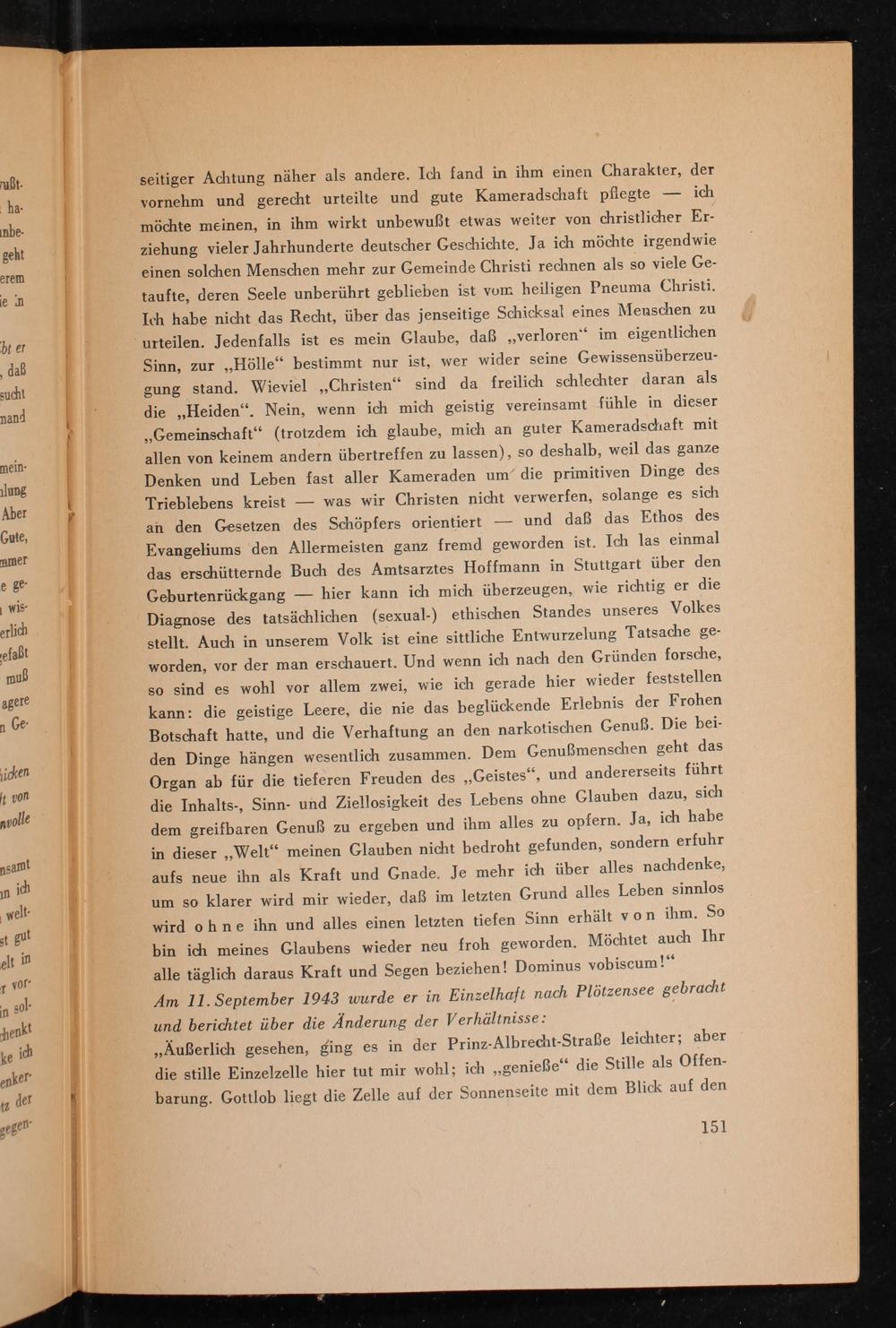 Am 11.September 1943 wurde er in Einzelhaft nach Plötzensee gebracht und berichtet über die Änderung der Verhältnisse: