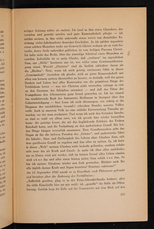 „Außerlich gesehen, ging es in der Prinz-Albrecht-Straße leichter; aber die stille Einzelzelle hier tut mir wohl; ich„genieße“ die Stille als Offen-
