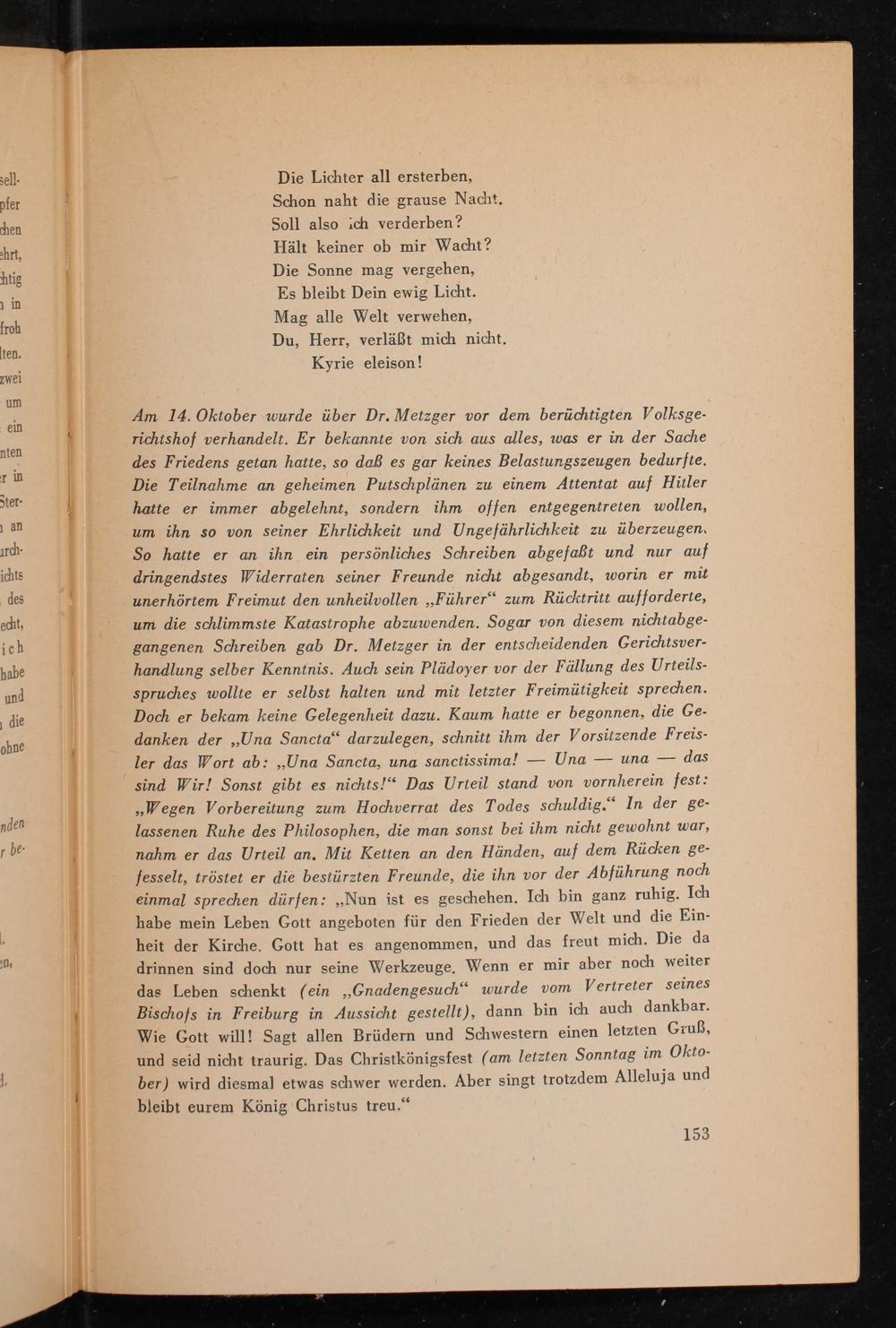 Am 14. Oktober wurde über Dr. Metzger vor dem berüchtigten Volksge- richtshof verhandelt. Er bekannte von sich aus alles, was er in der Sache des Friedens getan hatte, so daß es gar keines Belastungszeugen bedurfte. Die Teilnahme an geheimen Putschplänen zu einem Attentat auf Hitler hatte er immer abgelehnt, sondern ihm offen entgegentreten wollen, um ihn so von seiner Ehrlichkeit und Ungefährlichkeit zu überzeugen. So hatte er an ihn ein persönliches Schreiben abgefaßt und nur auf dringendstes Widerraten seiner Freunde nicht abgesandt, worin er mit unerhörtem Freimut den unheilvollen„Führer“ zum Rücktritt aufforderte, um die schlimmste Katastrophe abzuwenden. Sogar von diesem nichtabge- gangenen Schreiben gab Dr. Metzger in der entscheidenden Gerichtsver- handlung selber Kenntnis. Auch sein Plädoyer vor der Fällung des Urteils- spruches wollte er selbst halten und mit letzter Freimütigkeit sprechen. Doch er bekam keine Gelegenheit dazu. Kaum hatte er begonnen, die Ge- danken der„Una Sancta‘“ darzulegen, schnitt ihm der Vorsitzende Freis- ler das Wort ab:„Una Sancta, una sanctissima!— Una— una— das sind Wir! Sonst gibt es nichts!“ Das Urteil stand von vornherein fest: „Wegen Vorbereitung zum Hochverrat des Todes schuldig.“ In der ge- lassenen Ruhe des Philosophen, die man sonst bei ihm nicht gewohnt war, nahm er das Urteil an. Mit Ketten an den Händen, auf dem Rücken ge- fesselt, tröstet er die bestürzten Freunde, die ihn vor der Abführung noch einmal sprechen dürfen:„Nun ist es geschehen. Ich bin ganz ruhig. Ich habe mein Leben Gott angeboten für den Frieden der Welt und die Ein- heit der Kirche. Gott hat es angenommen, und das freut mich. Die da drinnen sind doch nur seine Werkzeuge. Wenn er mir aber noch weiter das Leben schenkt(ein„Gnadengesuch“ wurde vom Vertreter seines Bischofs in Freiburg in Aussicht gestellt), dann bin ich auch dankbar. Wie Gott will! Sagt allen Brüdern und Schwestern einen letzten Gruß, und seid nicht traurig. Das Christkönigsfest(am letzten Sonntag im Okto- ber) wird diesmal etwas schwer werden. Aber singt trotzdem Alleluja und