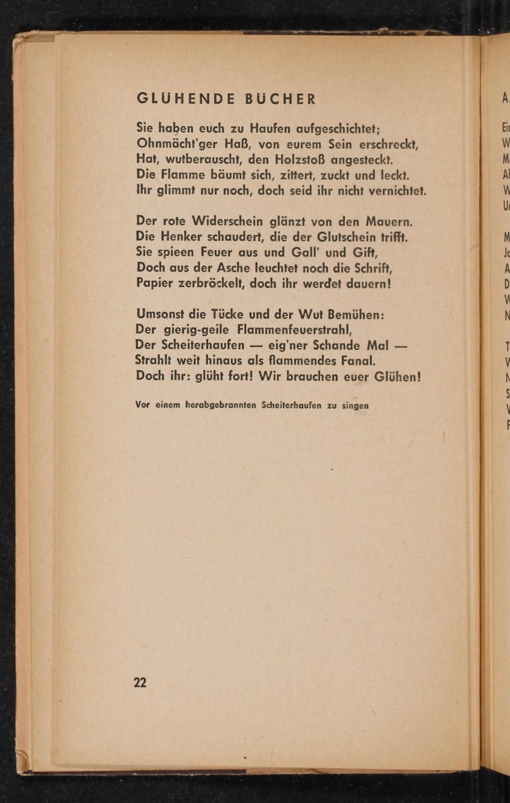 Der rote Widerschein glänzt von den Mauern. Die Henker schaudert, die der Glutschein trifft. Sie spieen Feuer aus und Gall’ und Gift, Doch avus der Asche leuchtet noch die Schrift, Papier zerbröckelt, doch ihr werdet dauern!