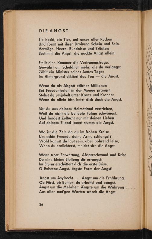Sie hockt, ein Tier, auf unser aller Rücken Und formt mit ihrer Drohung Schein und Sein. Verträge, Heere, Bündnisse und Brücken Bestimmt die Angst, die nackte Angst allein.