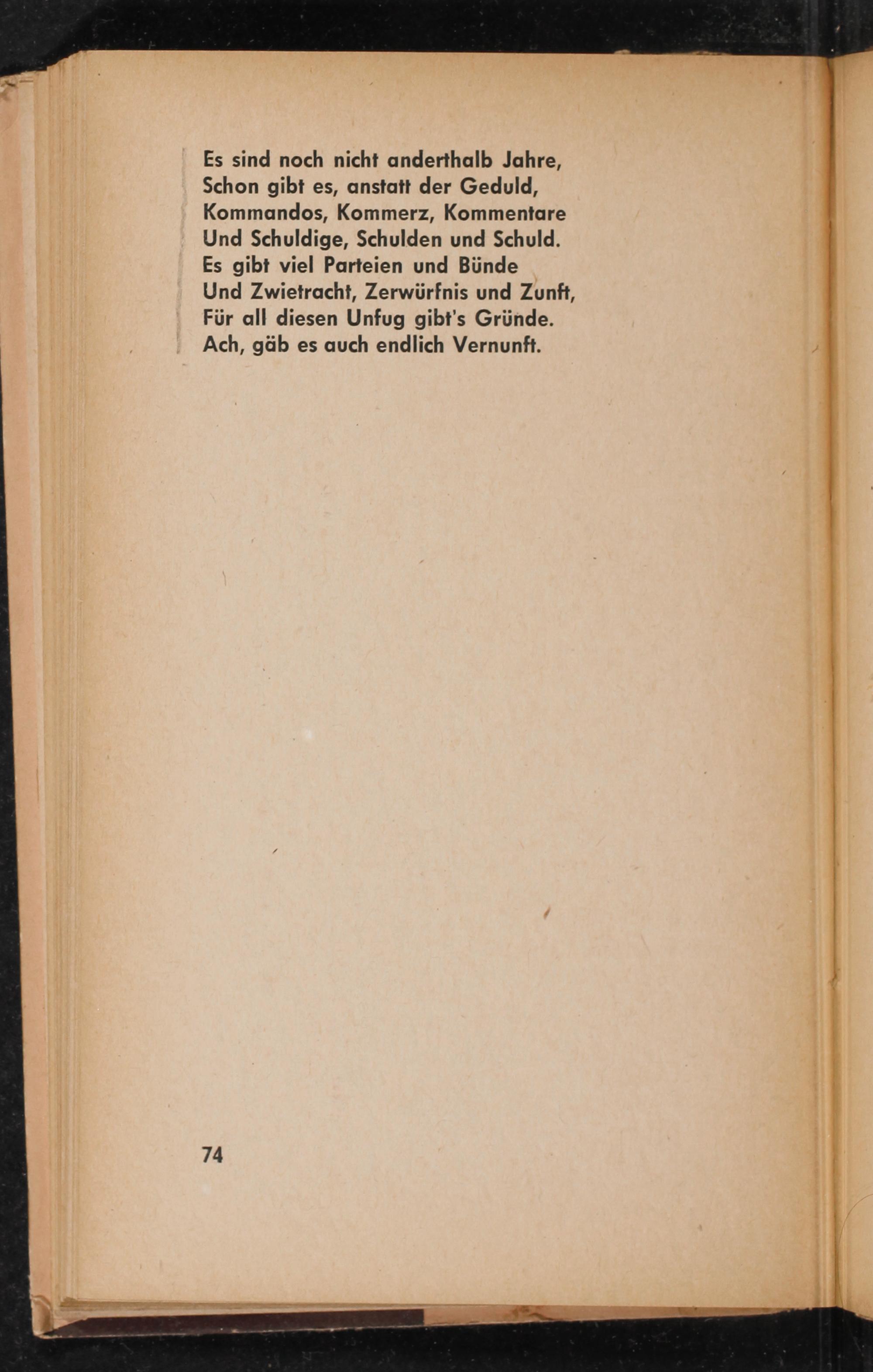 Es sind noch nicht anderthalb Jahre, Schon gibt es, anstatt der Geduld, Kommandos, Kommerz, Kommentare Und Schuldige, Schulden und Schuld. Es gibt viel Parteien und Bünde Und Zwietracht, Zerwürfnis und Zunft, Für all diesen Unfug gibt's Gründe. Ach, gäb es auch endlich Vernunft.