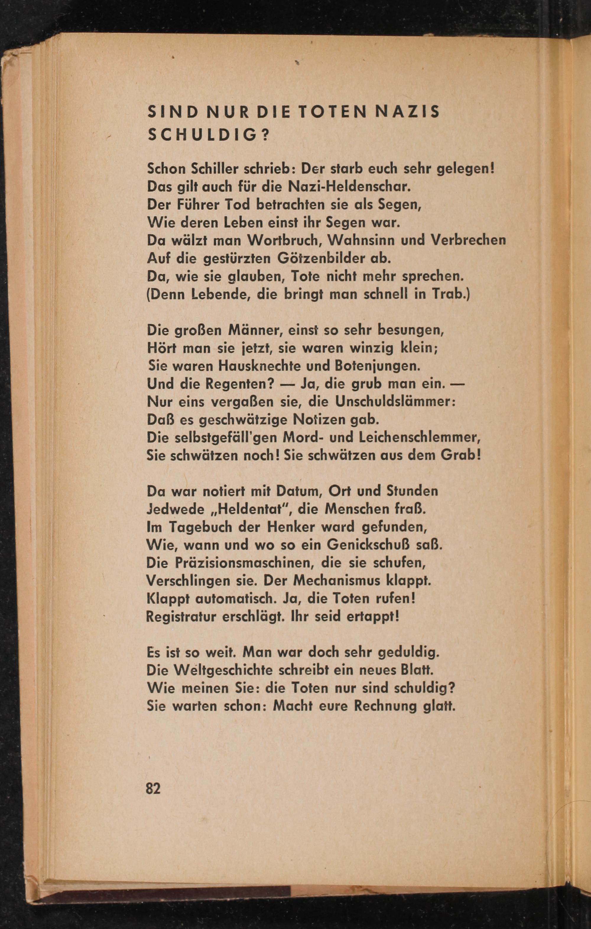 Da war notiert mit Datum, Ort und Stunden Jedwede ,, Heldentat", die Menschen fraẞ. Im Tagebuch der Henker ward gefunden, Wie, wann und wo so ein Genickschuß saẞ. Die Präzisionsmaschinen, die sie schufen, Verschlingen sie. Der Mechanismus klappt. Klappt automatisch. Ja, die Toten rufen! Registratur erschlägt. Ihr seid ertappt!