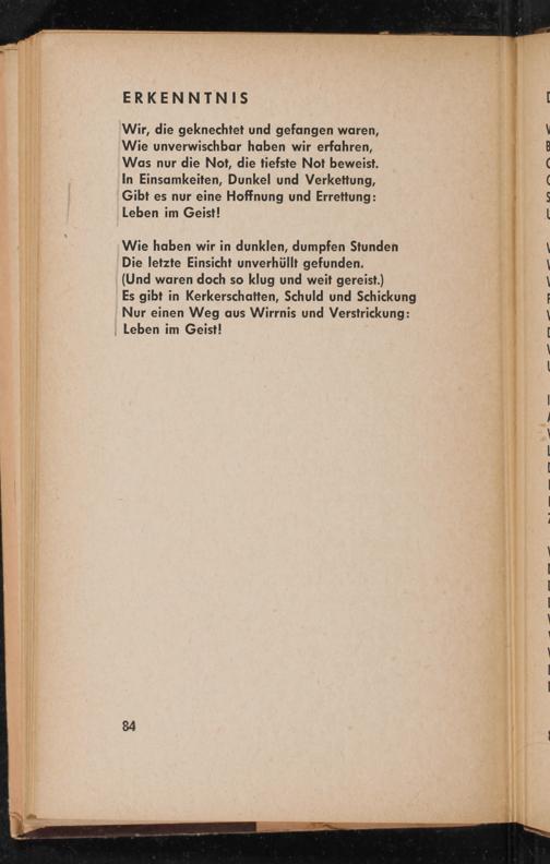 Wie haben wir in dunklen, dumpfen Stunden Die letzte Einsicht unverhüllt gefunden. ( Und waren doch so klug und weit gereist.) Es gibt in Kerkerschatten, Schuld und Schickung Nur einen Weg aus Wirrnis und Verstrickung: Leben im Geist!