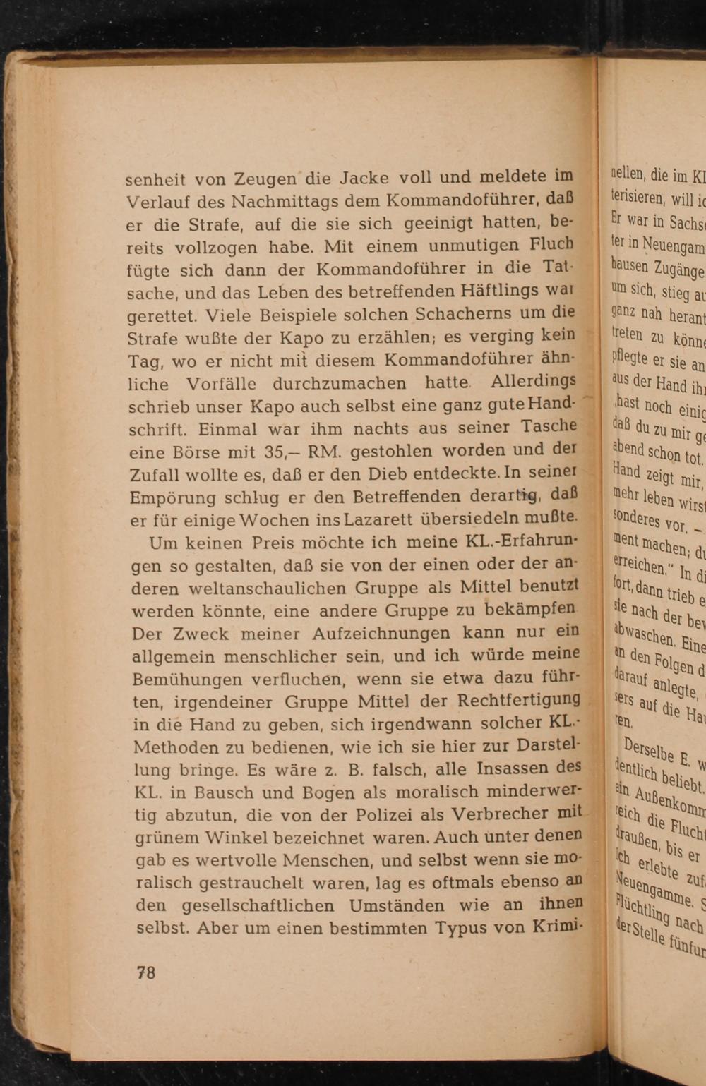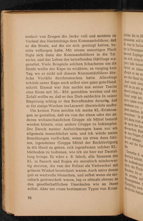 senheit von Zeugen die Jacke voll und meldete im Verlauf des Nachmittags dem Kommandoführer, daß er die Strafe, auf die sie sich geeinigt hatten, bereits vollzogen habe. Mit einem unmutigen Fluch fügte sich dann der Kommandoführer in die Tatsache, und das Leben des betreffenden Häftlings war gerettet. Viele Beispiele solchen Schacherns um die Strafe wußte der Kapo zu erzählen; es verging kein Tag, wo er nicht mit diesem Kommandoführer ähnliche Vorfälle durchzumachen hatte. Allerdings schrieb unser Kapo auch selbst eine ganz gute Handschrift. Einmal war ihm nachts aus seiner Tasche eine Börse mit 35,- RM. gestohlen worden und der Zufall wollte es, daß er den Dieb entdeckte. In seiner Empörung schlug er den Betreffenden derartig, daß er für einige Wochen ins Lazarett übersiedeln mußte. Um keinen Preis möchte ich meine KL.- Erfahrungen so gestalten, daß sie von der einen oder der anderen weltanschaulichen Gruppe als Mittel benutzt werden könnte, eine andere Gruppe zu bekämpfen. Der Zweck meiner Aufzeichnungen kann nur ein allgemein menschlicher sein, und ich würde meine Bemühungen verfluchen, wenn sie etwa dazu führten, irgendeiner Gruppe Mittel der Rechtfertigung in die Hand zu geben, sich irgendwann solcher KL.Methoden zu bedienen, wie ich sie hier zur Darstellung bringe. Es wäre z. B. falsch, alle Insassen des KL. in Bausch und Bogen als moralisch minderwer tig abzutun, die von der Polizei als Verbrecher mit grünem Winkel bezeichnet waren. Auch unter denen gab es wertvolle Menschen, und selbst wenn sie moralisch gestrauchelt waren, lag es oftmals ebenso an den gesellschaftlichen Umständen wie an ihnen selbst. Aber um einen bestimmten Typus von Krimi