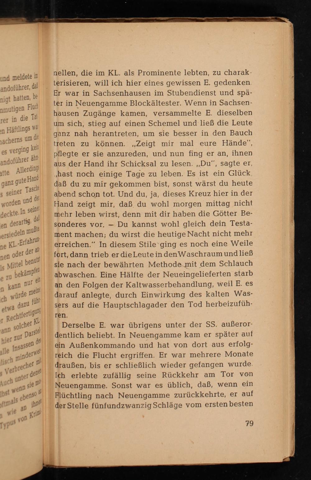 nellen, die im KL. als Prominente lebten, zu charak terisieren, will ich hier eines gewissen E. gedenken. Er war in Sachsenhausen im Stubendienst und später in Neuengamme Blockältester. Wenn in Sachsenhausen Zugänge kamen, versammelte E. dieselben um sich, stieg auf einen Schemel und ließ die Leute ganz nah herantreten, um sie besser in den Bauch treten zu können. ,, Zeigt mir mal eure Hände", pflegte er sie anzureden, und nun fing er an, ihnen aus der Hand ihr Schicksal zu lesen. ,, Du", sagte er, , hast noch einige Tage zu leben. Es ist ein Glück, daß du zu mir gekommen bist, sonst wärst du heute abend schon tot. Und du, ja, dieses Kreuz hier in der Hand zeigt mir, daß du wohl morgen mittag nicht mehr leben wirst, denn mit dir haben die Götter Besonderes vor. Du kannst wohl gleich dein Testament machen; du wirst die heutige Nacht nicht mehr erreichen." In diesem Stile ging es noch eine Weile fort, dann trieb er die Leute in den Waschraum und ließ sie nach der bewährten Methode mit dem Schlauch abwaschen. Eine Hälfte der Neueingelieferten starb an den Folgen der Kaltwasserbehandlung, weil E. es darauf anlegte, durch Einwirkung des kalten Wassers auf die Hauptschlagader den Tod herbeizufüh