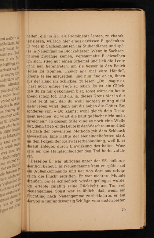 Derselbe E. war übrigens unter der SS. außerordentlich beliebt. In Neuengamme kam er später auf ein Außenkommando und hat von dort aus erfolgreich die Flucht ergriffen. Er war mehrere Monate draußen, bis er schließlich wieder gefangen wurde. Ich erlebte zufällig seine Rückkehr am Tor von Neuengamme . Sonst war es üblich, daß, wenn ein Flüchtling nach Neuengamme zurückkehrte, er auf der Stelle fünfundzwanzig Schläge vom ersten besten