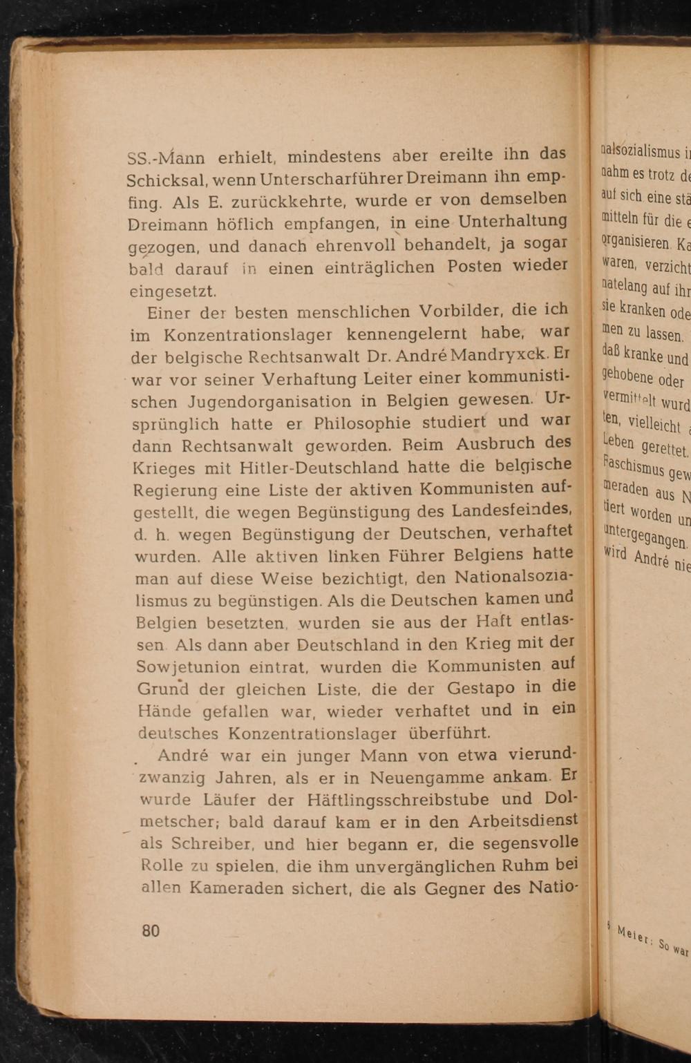Einer der besten menschlichen Vorbilder, die ich im Konzentrationslager kennengelernt habe, war der belgische Rechtsanwalt Dr. André Mandryxek. Er war vor seiner Verhaftung Leiter einer kommunistischen Jugendorganisation in Belgien gewesen. Ursprünglich hatte er Philosophie studiert und war dann Rechtsanwalt geworden. Beim Ausbruch des Krieges mit Hitler- Deutschland hatte die belgische Regierung eine Liste der aktiven Kommunisten aufgestellt, die wegen Begünstigung des Landesfeindes, d. h. wegen Begünstigung der Deutschen , verhaftet wurden. Alle aktiven linken Führer Belgiens hatte man auf diese Weise bezichtigt, den Nationalsozialismus zu begünstigen. Als die Deutschen kamen und Belgien besetzten, wurden sie aus der Haft entlassen. Als dann aber Deutschland in den Krieg mit der Sowjetunion eintrat, wurden die Kommunisten auf Grund der gleichen Liste, die der Gestapo in die Hände gefallen war, wieder verhaftet und in ein deutsches Konzentrationslager überführt.