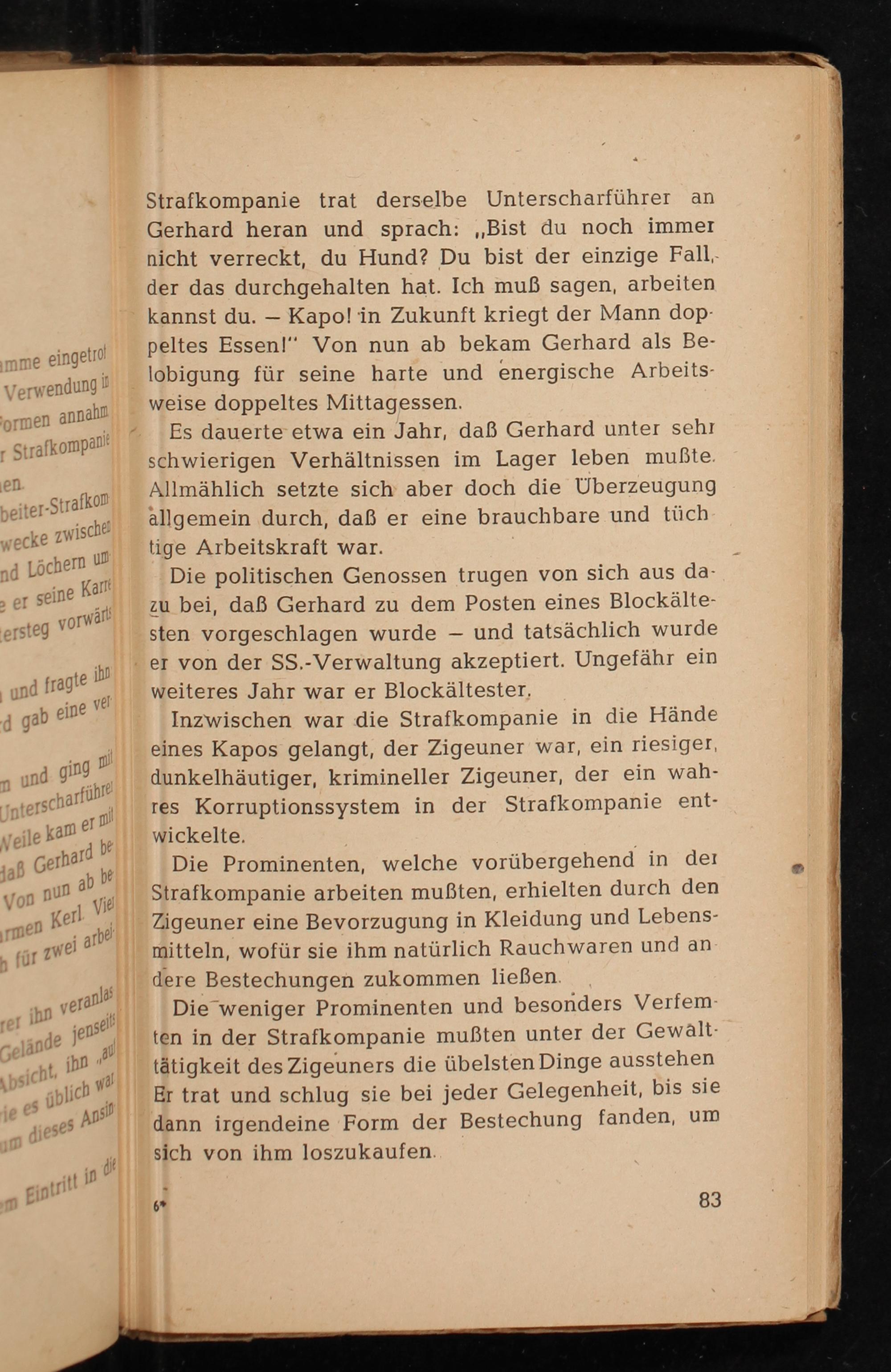 Strafkompanie trat derselbe Unterscharführer an Gerhard heran und sprach: Bist du noch immer nicht verreckt, du Hund? Du bist der einzige Fall,- der das durchgehalten hat. Ich muß sagen, arbeiten kannst du. Kapo! in Zukunft kriegt der Mann dop peltes Essen!" Von nun ab bekam Gerhard als Belobigung für seine harte und energische Arbeitsweise doppeltes Mittagessen.