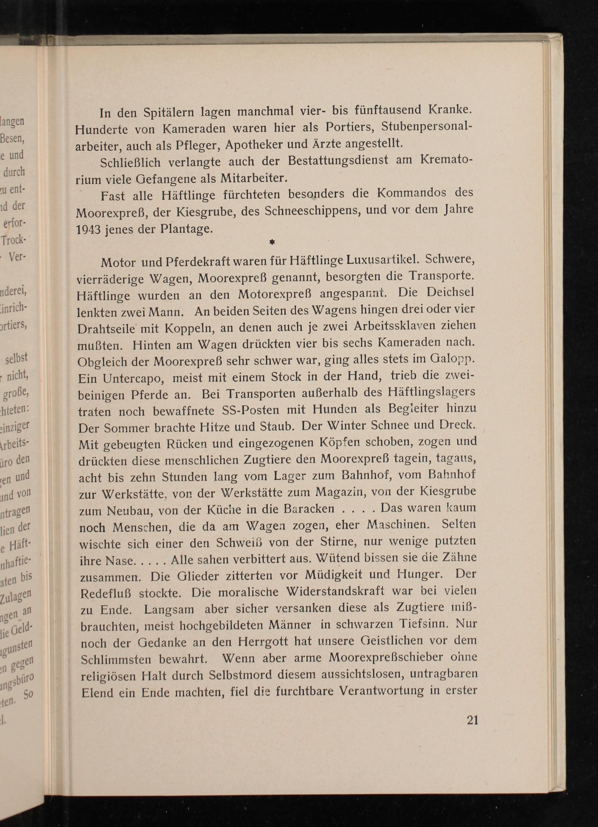 Motor und Pferdekraft waren für Häftlinge Luxusartikel. Schwere, vierräderige Wagen, Moorexpreß genannt, besorgten die Transporte. Häftlinge wurden an den Motorexpreß angespannt. Die Deichsel lenkten zwei Mann. An beiden Seiten des Wagens hingen drei oder vier Drahtseile mit Koppeln, an denen auch je zwei Arbeitssklaven ziehen mußten. Hinten am Wagen drückten vier bis sechs Kameraden nach. Obgleich der Moorexpreß sehr schwer war, ging alles stets im Galopp. Ein Untercapo, meist mit einem Stock in der Hand, trieb die zweibeinigen Pferde an. Bei Transporten außerhalb des Häftlingslagers traten noch bewaffnete SS- Posten mit Hunden als Begleiter hinzu Der Sommer brachte Hitze und Staub. Der Winter Schnee und Dreck. Mit gebeugten Rücken und eingezogenen Köpfen schoben, zogen und drückten diese menschlichen Zugtiere den Moorexpreß tagein, tagaus, acht bis zehn Stunden lang vom Lager zum Bahnhof, vom Bahnhof zur Werkstätte, von der Werkstätte zum Magazin, von der Kiesgrube ... Das waren kaum zum Neubau, von der Küche in die Baracken. noch Menschen, die da am Wagen zogen, eher Maschinen. Selten wischte sich einer den Schweiß von der Stirne, nur wenige putzten ihre Nase..... Alle sahen verbittert aus. Wütend bissen sie die Zähne zusammen. Die Glieder zitterten vor Müdigkeit und Hunger. Der Redefluß stockte. Die moralische Widerstandskraft war bei vielen zu Ende. Langsam aber sicher versanken diese als Zugtiere miẞbrauchten, meist hochgebildeten Männer in schwarzen Tiefsinn. Nur noch der Gedanke an den Herrgott hat unsere Geistlichen vor dem Schlimmsten bewahrt. Wenn aber arme Moorexpreßschieber ohne religiösen Halt durch Selbstmord diesem aussichtslosen, untragbaren Elend ein Ende machten, fiel die furchtbare Verantwortung in erster