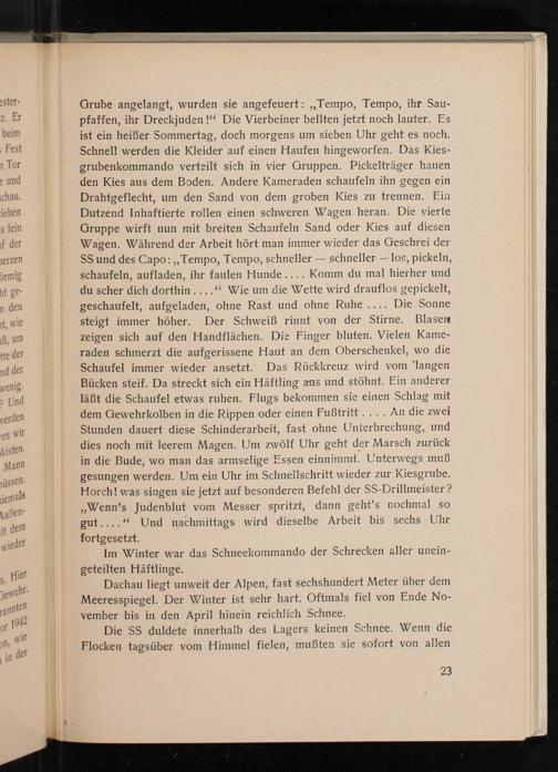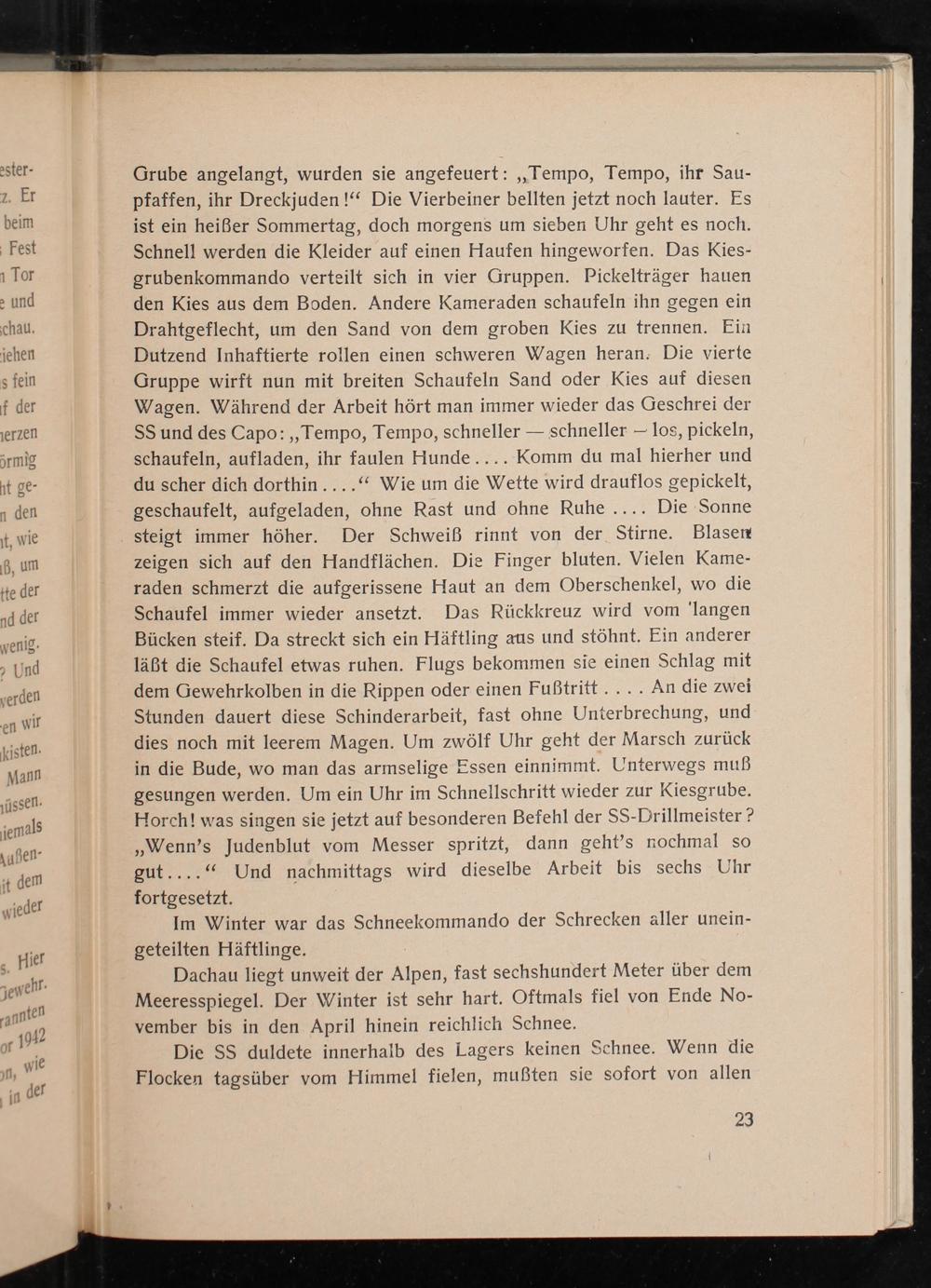 Grube angelangt, wurden sie angefeuert: ,, Tempo, Tempo, ihr Saupfaffen, ihr Dreckjuden!" Die Vierbeiner bellten jetzt noch lauter. Es ist ein heißer Sommertag, doch morgens um sieben Uhr geht es noch. Schnell werden die Kleider auf einen Haufen hingeworfen. Das Kiesgrubenkommando verteilt sich in vier Gruppen. Pickelträger hauen den Kies aus dem Boden. Andere Kameraden schaufeln ihn gegen ein Drahtgeflecht, um den Sand von dem groben Kies zu trennen. Ein Dutzend Inhaftierte rollen einen schweren Wagen heran. Die vierte Gruppe wirft nun mit breiten Schaufeln Sand oder Kies auf diesen Wagen. Während der Arbeit hört man immer wieder das Geschrei der SS und des Capo: ,, Tempo, Tempo, schneller- schneller- los, pickeln, schaufeln, aufladen, ihr faulen Hunde.... Komm du mal hierher und du scher dich dorthin...." Wie um die Wette wird drauflos gepickelt, geschaufelt, aufgeladen, ohne Rast und ohne Ruhe.... Die Sonne steigt immer höher. Der Schweiß rinnt von der Stirne. Blasen zeigen sich auf den Handflächen. Die Finger bluten. Vielen Kameraden schmerzt die aufgerissene Haut an dem Oberschenkel, wo die Schaufel immer wieder ansetzt. Das Rückkreuz wird vom' langen Bücken steif. Da streckt sich ein Häftling aus und stöhnt. Ein anderer läßt die Schaufel etwas ruhen. Flugs bekommen sie einen Schlag mit dem Gewehrkolben in die Rippen oder einen Fußtritt.... An die zwei Stunden dauert diese Schinderarbeit, fast ohne Unterbrechung, und dies noch mit leerem Magen. Um zwölf Uhr geht der Marsch zurück in die Bude, wo man das armselige Essen einnimmt. Unterwegs muß gesungen werden. Um ein Uhr im Schnellschritt wieder zur Kiesgrube. Horch! was singen sie jetzt auf besonderen Befehl der SS- Drillmeister? Wenn's Judenblut vom Messer spritzt, dann geht's nochmal so gut...." Und nachmittags wird dieselbe Arbeit bis sechs Uhr fortgesetzt.
