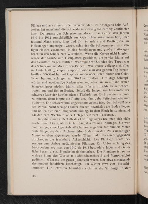 Innerhalb und außerhalb des Häftlingslagers breiteten sich viele Gärten aus. Der größte Garten trug den Namen Plantage. Sie war eine riesige, viereckige Anbaufläche von ungefähr fünfhundert Meter Seitenlänge, die dem Dachauer Moorboden um den Preis unzähliger Menschenleben abgerungen wurde. Wege und Entwässerungsgräben durchzogen die fruchtbare Ackerschicht. Die Plantage diente besonders zum Anbau medizinischer Pflanzen. Zur Urbarmachung des Moorbodens zog man von 1940 bis 1943 besonders Juden und Geistliche heran, die zu Hunderten dahinstarben. Die Plantage ist so im wahren Sinne des Wortes mit Menschenschweiß und Menschenblut gedüngt. Während der guten Jahreszeit waren hier etwa eintausenddreihundert Inhaftierte beschäftigt. Im Winter etwa vier- bis achthundert. Die letzteren bemühten sich um die Sämlinge in den