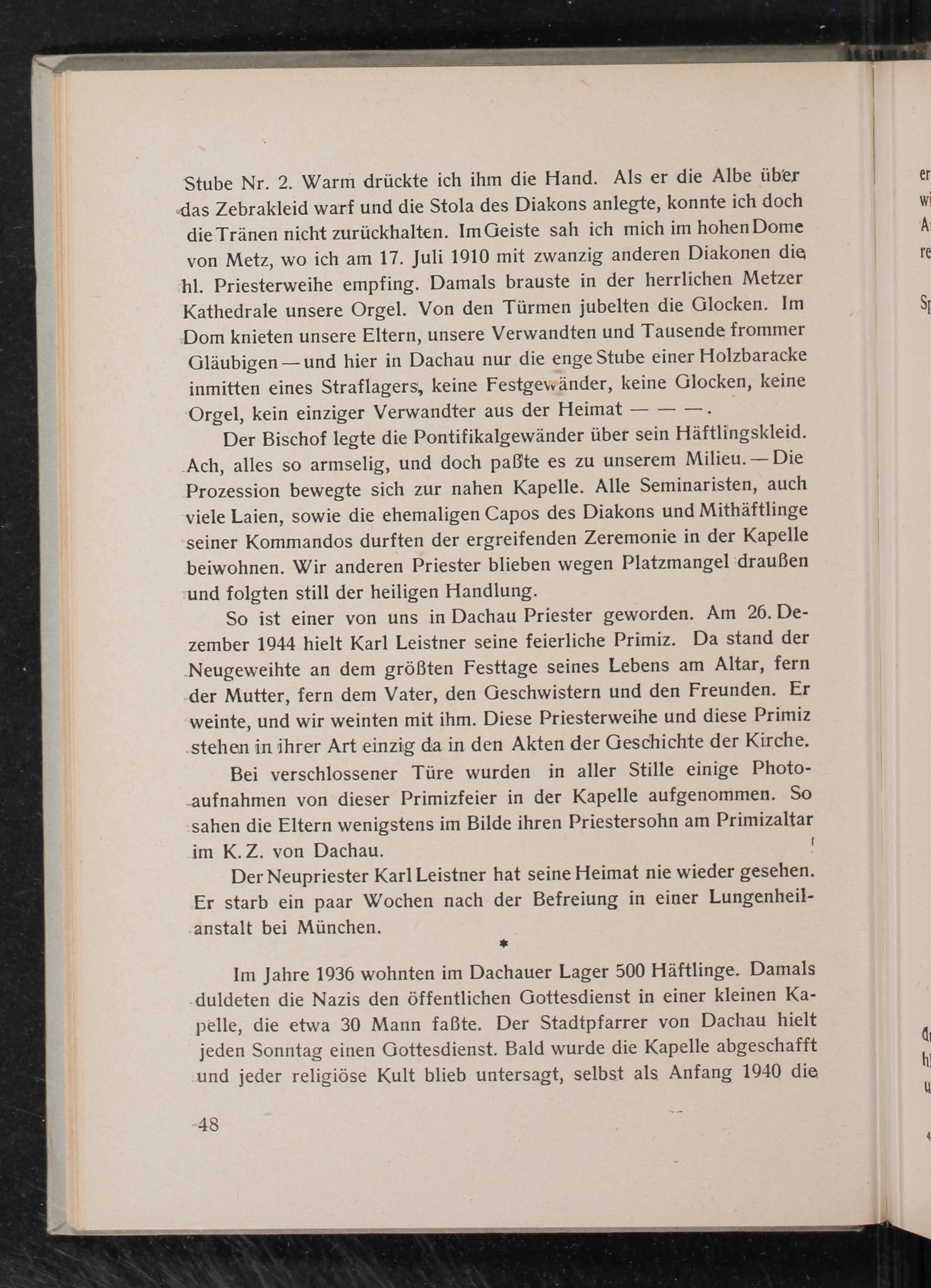So ist einer von uns in Dachau Priester geworden. Am 26. De- zember 1944 hielt Karl Leistner seine feierliche Primiz. Da stand der Neugeweihte an dem größten Festtage seines Lebens am Altar, fern der Mutter, fern dem Vater, den Geschwistern und den Freunden. Er weinte, und wir weinten mit ihm. Diese Priesterweihe und diese Primiz stehen in ihrer Art einzig da in den Akten der Geschichte der Kirche.