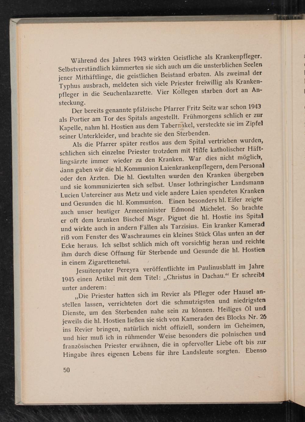 Jesuitenpater Pereyra veröffentlichte im Paulinusblatt im Jahre 1945 einen Artikel mit dem Titel: ,, Christus in Dachau ." Er schreibt unter anderem: