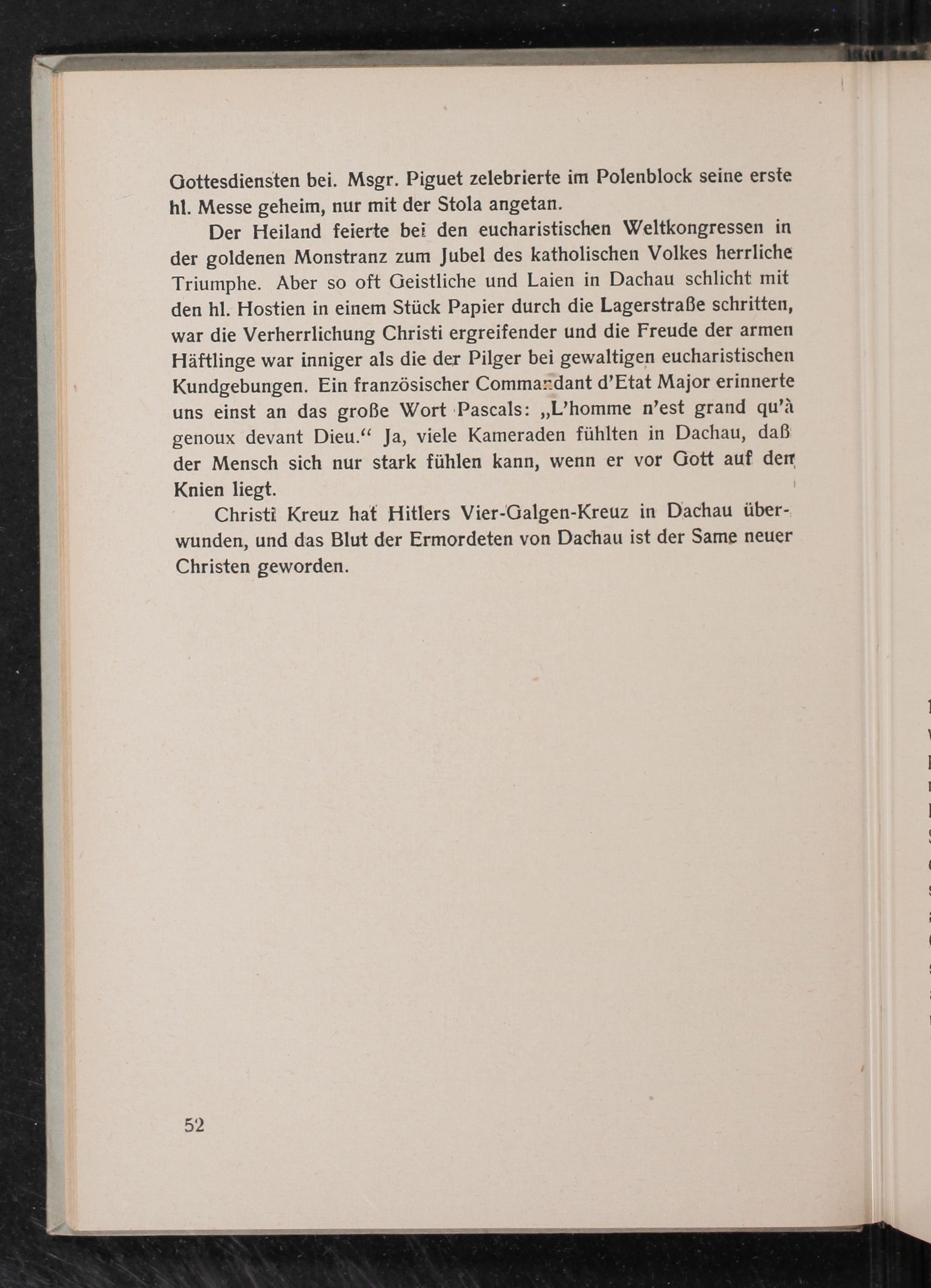 Der Heiland feierte bei den eucharistischen Weltkongressen in der goldenen Monstranz zum Jubel des katholischen Volkes herrliche Triumphe. Aber so oft Geistliche und Laien in Dachau schlicht mit den hl. Hostien in einem Stück Papier durch die Lagerstraße schritten, war die Verherrlichung Christi ergreifender und die Freude der armen Häftlinge war inniger als die der Pilger bei gewaltigen eucharistischen Kundgebungen. Ein französischer Commandant d'Etat Major erinnerte uns einst an das große Wort Pascals: ,, L'homme n'est grand qu'à genoux devant Dieu." Ja, viele Kameraden fühlten in Dachau , daß der Mensch sich nur stark fühlen kann, wenn er vor Gott auf der Knien liegt.