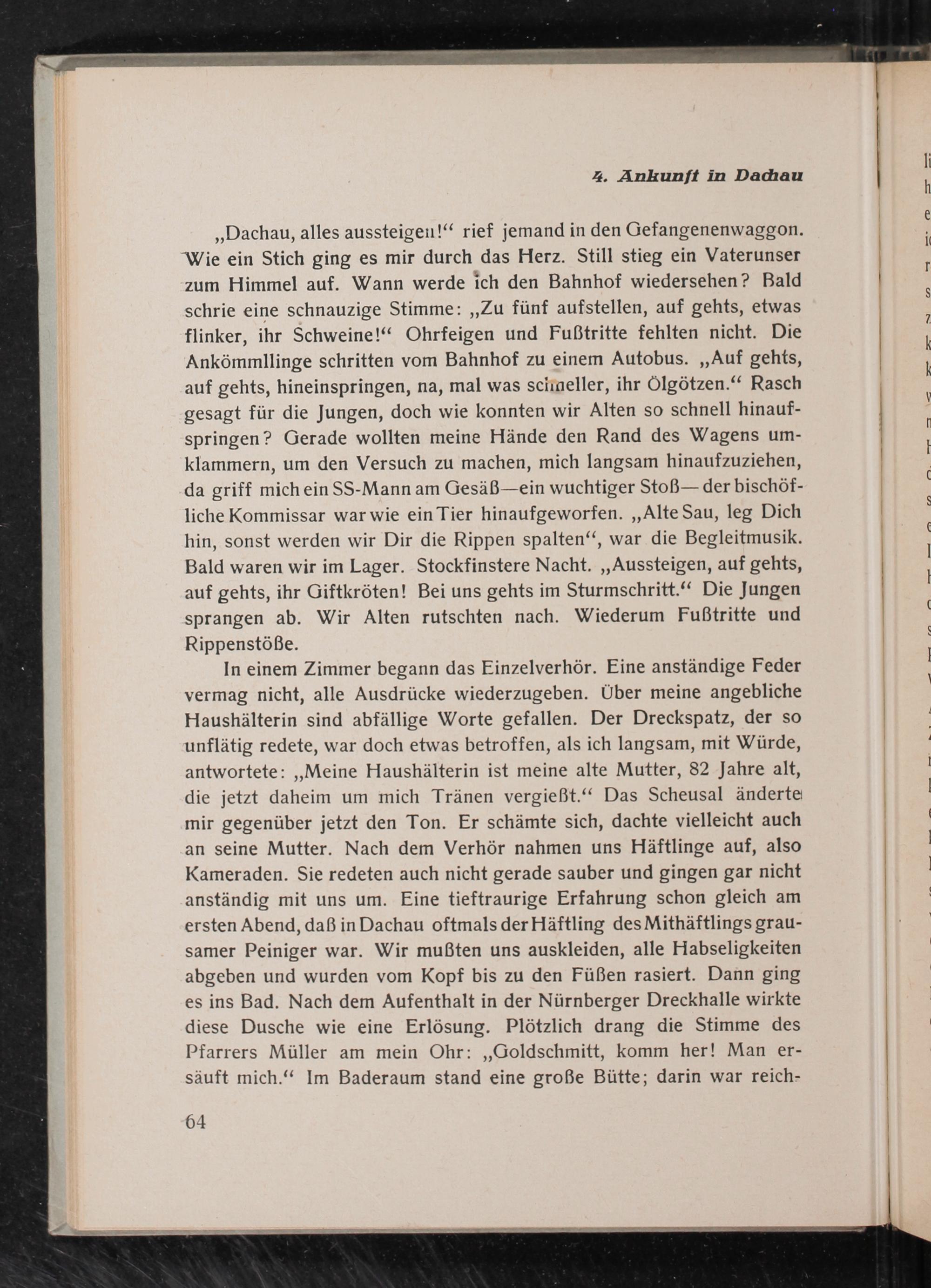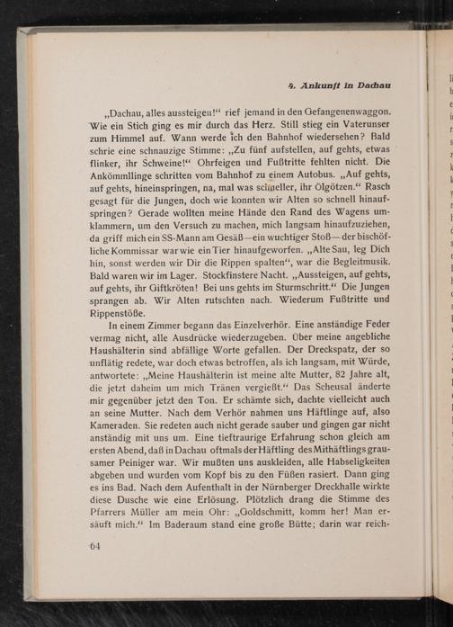 In einem Zimmer begann das Einzelverhör. Eine anständige Feder vermag nicht, alle Ausdrücke wiederzugeben. Über meine angebliche Haushälterin sind abfällige Worte gefallen. Der Dreckspatz, der so unflätig redete, war doch etwas betroffen, als ich langsam, mit Würde, antwortete: ,, Meine Haushälterin ist meine alte Mutter, 82 Jahre alt, die jetzt daheim um mich Tränen vergießt." Das Scheusal änderte mir gegenüber jetzt den Ton. Er schämte sich, dachte vielleicht auch an seine Mutter. Nach dem Verhör nahmen uns Häftlinge auf, also Kameraden. Sie redeten auch nicht gerade sauber und gingen gar nicht anständig mit uns um. Eine tieftraurige Erfahrung schon gleich am ersten Abend, daß in Dachau oftmals der Häftling des Mithäftlings grausamer Peiniger war. Wir mußten uns auskleiden, alle Habseligkeiten abgeben und wurden vom Kopf bis zu den Füßen rasiert. Dann ging es ins Bad . Nach dem Aufenthalt in der Nürnberger Dreckhalle wirkte diese Dusche wie eine Erlösung. Plötzlich drang die Stimme des Pfarrers Müller am mein Ohr: ,, Goldschmitt, komm her! Man ersäuft mich." Im Baderaum stand eine große Bütte; darin war reich