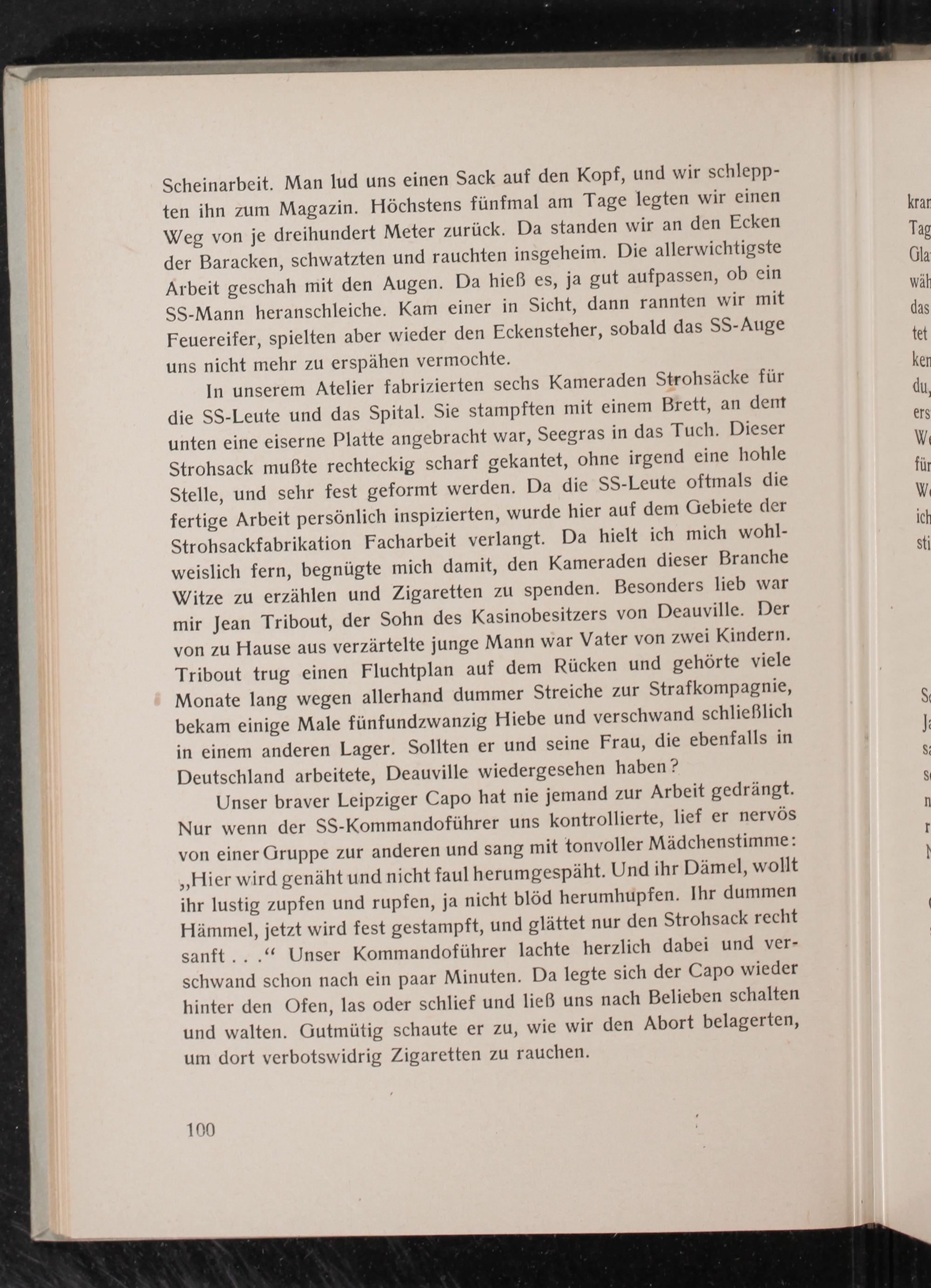 In unserem Atelier fabrizierten sechs Kameraden Strohsäcke für die SS - Leute und das Spital. Sie stampften mit einem Brett, an dent unten eine eiserne Platte angebracht war, Seegras in das Tuch. Dieser Strohsack mußte rechteckig scharf gekantet, ohne irgend eine hohle Stelle, und sehr fest geformt werden. Da die SS - Leute oftmals die fertige Arbeit persönlich inspizierten, wurde hier auf dem Gebiete der Strohsackfabrikation Facharbeit verlangt. Da hielt ich mich wohlweislich fern, begnügte mich damit, den Kameraden dieser Branche Witze zu erzählen und Zigaretten zu spenden. Besonders lieb war mir Jean Tribout, der Sohn des Kasinobesitzers von Deauville . Der von zu Hause aus verzärtelte junge Mann war Vater von zwei Kindern. Tribout trug einen Fluchtplan auf dem Rücken und gehörte viele ¡ Monate lang wegen allerhand dummer Streiche zur Strafkompagnie, bekam einige Male fünfundzwanzig Hiebe und verschwand schließlich in einem anderen Lager. Sollten er und seine Frau, die ebenfalls in Deutschland arbeitete, Deauville wiedergesehen haben?