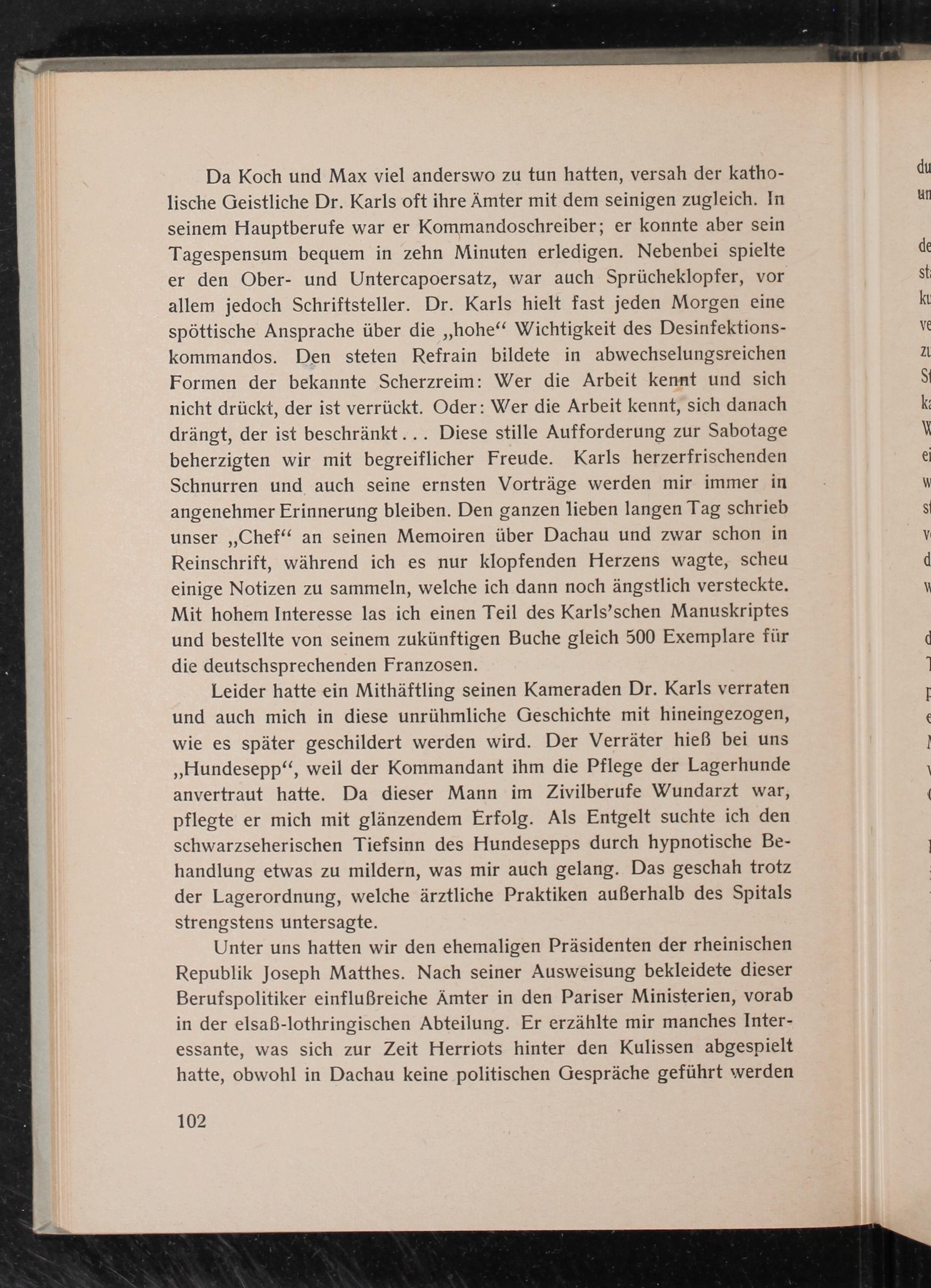 Unter uns hatten wir den ehemaligen Präsidenten der rheinischen Republik Joseph Matthes. Nach seiner Ausweisung bekleidete dieser Berufspolitiker einflußreiche Ämter in den Pariser Ministerien, vorab in der elsaẞ- lothringischen Abteilung. Er erzählte mir manches Interessante, was sich zur Zeit Herriots hinter den Kulissen abgespielt hatte, obwohl in Dachau keine politischen Gespräche geführt werden