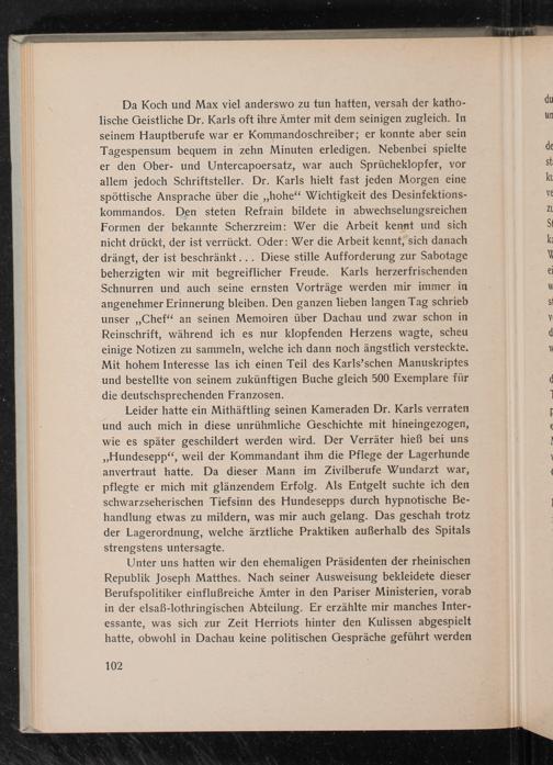 Da Koch und Max viel anderswo zu tun hatten, versah der katholische Geistliche Dr. Karls oft ihre Ämter mit dem seinigen zugleich. In seinem Hauptberufe war er Kommandoschreiber; er konnte aber sein Tagespensum bequem in zehn Minuten erledigen. Nebenbei spielte er den Ober- und Untercapoersatz, war auch Sprücheklopfer, vor allem jedoch Schriftsteller. Dr. Karls hielt fast jeden Morgen eine spöttische Ansprache über die ,, hohe" Wichtigkeit des Desinfektionskommandos. Den steten Refrain bildete in abwechselungsreichen Formen der bekannte Scherzreim: Wer die Arbeit kennt und sich nicht drückt, der ist verrückt. Oder: Wer die Arbeit kennt, sich danach drängt, der ist beschränkt... Diese stille Aufforderung zur Sabotage beherzigten wir mit begreiflicher Freude. Karls herzerfrischenden Schnurren und auch seine ernsten Vorträge werden mir immer in angenehmer Erinnerung bleiben. Den ganzen lieben langen Tag schrieb unser ,, Chef" an seinen Memoiren über Dachau und zwar schon in Reinschrift, während ich es nur klopfenden Herzens wagte, scheu einige Notizen zu sammeln, welche ich dann noch ängstlich versteckte. Mit hohem Interesse las ich einen Teil des Karls'schen Manuskriptes und bestellte von seinem zukünftigen Buche gleich 500 Exemplare für die deutschsprechenden Franzosen.