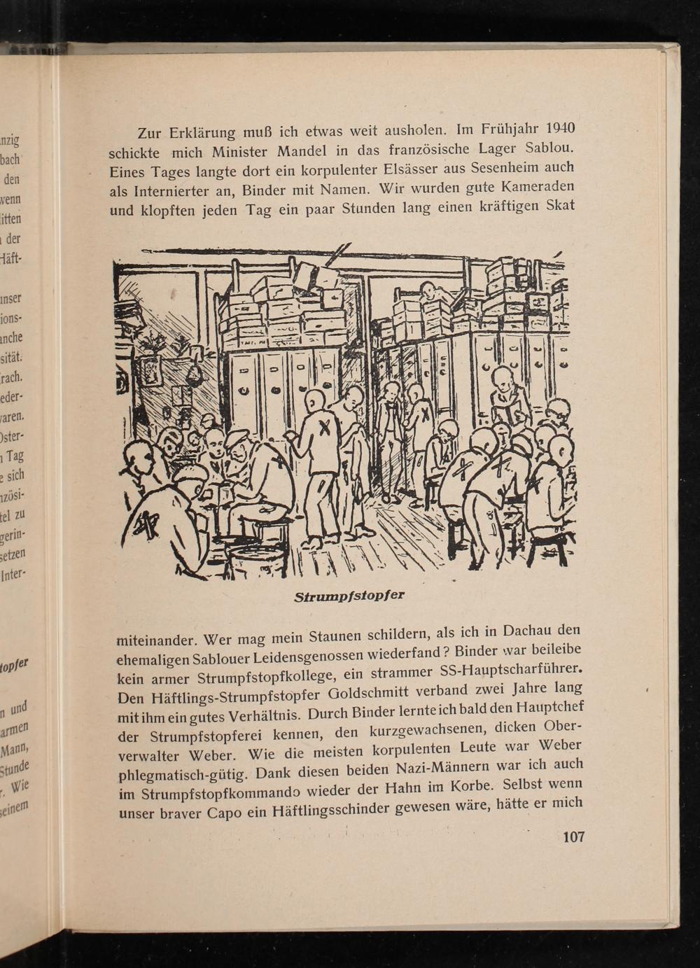 Zur Erklärung muß ich etwas weit ausholen. Im Frühjahr 1940 schickte mich Minister Mandel in das französische Lager Sablou. Eines Tages langte dort ein korpulenter Elsässer aus Sesenheim auch als Internierter an, Binder mit Namen. Wir wurden gute Kameraden und klopften jeden Tag ein paar Stunden lang einen kräftigen Skat