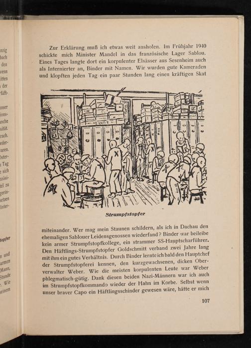 miteinander. Wer mag mein Staunen schildern, als ich in Dachau den ehemaligen Sablouer Leidensgenossen wiederfand? Binder war beileibe kein armer Strumpfstopfkollege, ein strammer SS- Hauptscharführer. Den Häftlings- Strumpfstopfer Goldschmitt verband zwei Jahre lang mit ihm ein gutes Verhältnis. Durch Binder lernte ich bald den Hauptchef der Strumpfstopferei kennen, den kurzgewachsenen, dicken Oberverwalter Weber. Wie die meisten korpulenten Leute war Weber phlegmatisch- gütig. Dank diesen beiden Nazi- Männern war ich auch im Strumpfstopfkommandɔ wieder der Hahn im Korbe. Selbst wenn unser braver Capo ein Häftlingsschinder gewesen wäre, hätte er mich