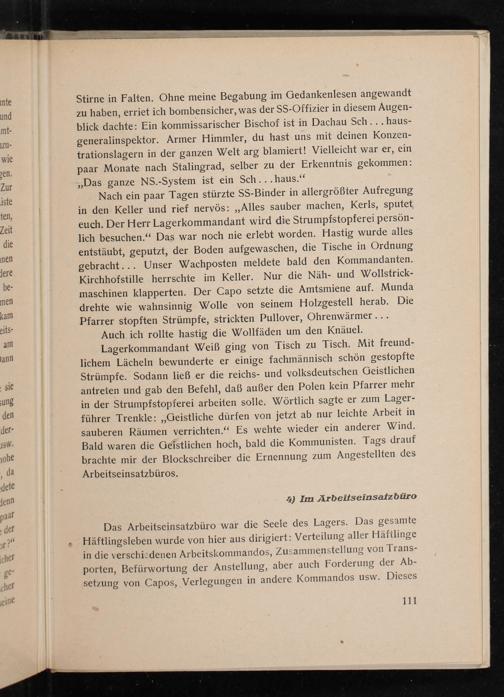 Stirne in Falten. Ohne meine Begabung im Gedankenlesen angewandt zu haben, erriet ich bombensicher, was der SS -Offizier in diesem Augen- blick dachte: Ein kommissarischer Bischof ist in Dachau Sch...haus- generalinspektor. Armer Himmler, du hast uns mit deinen Konzen- trationslagern in der ganzen Welt arg blamiert! Vielleicht war er, ein paar Monate nach Stalingrad , selber zu der Erkenntnis gekommen: „Das ganze NS.-System ist ein Sch hatlsse; Nach ein paar Tagen stürzte SS-Binder in allergrößter Aufregung in den Keller und rief nervös:„Alles sauber machen, Kerls, sputet euch. Der Herr Lagerkommandant wird die Strumpfstopferei persön- lich besuchen.“ Das war noch nie erlebt worden. Hastig wurde alles entstäubt, geputzt, der Boden aufgewaschen, die Tische in Ordnung gebracht... Unser Wachposten meldete bald den Kommandanten. Kirchhofstille herrschte im Keller. Nur die Näh- und Wollstrick- maschinen klapperten. Der Capo setzte die Amtsmiene auf. Munda drehte wie wahnsinnig Wolle von seinem Holzgestell herab. Die Pfarrer stopften Strümpfe, strickten Pullover, Ohrenwärmer... Auch ich rollte hastig die Wollfäden um den Knäuel. Lagerkommandant Weiß ging von Tisch zu Tisch. Mit freund- lichem Lächeln bewunderte er einige fachmännisch schön gestopfte Strümpfe. Sodann ließ er die reichs- und volksdeutschen Geistlichen antreten und gab den Befehl, daß außer den Polen kein Pfarrer mehr in der Strumpfstopferei arbeiten solle. Wörtlich sagte er zum Lager- führer Trenkle:„Geistliche dürfen von jetzt ab nur leichte Arbeit in sauberen Räumen verrichten.“ Es wehte wieder ein anderer Wind. Bald waren die Geistlichen hoch, bald die Kommunisten. Tags drauf brachte mir der Blockschreiber die Ernennung zum Angestellten des