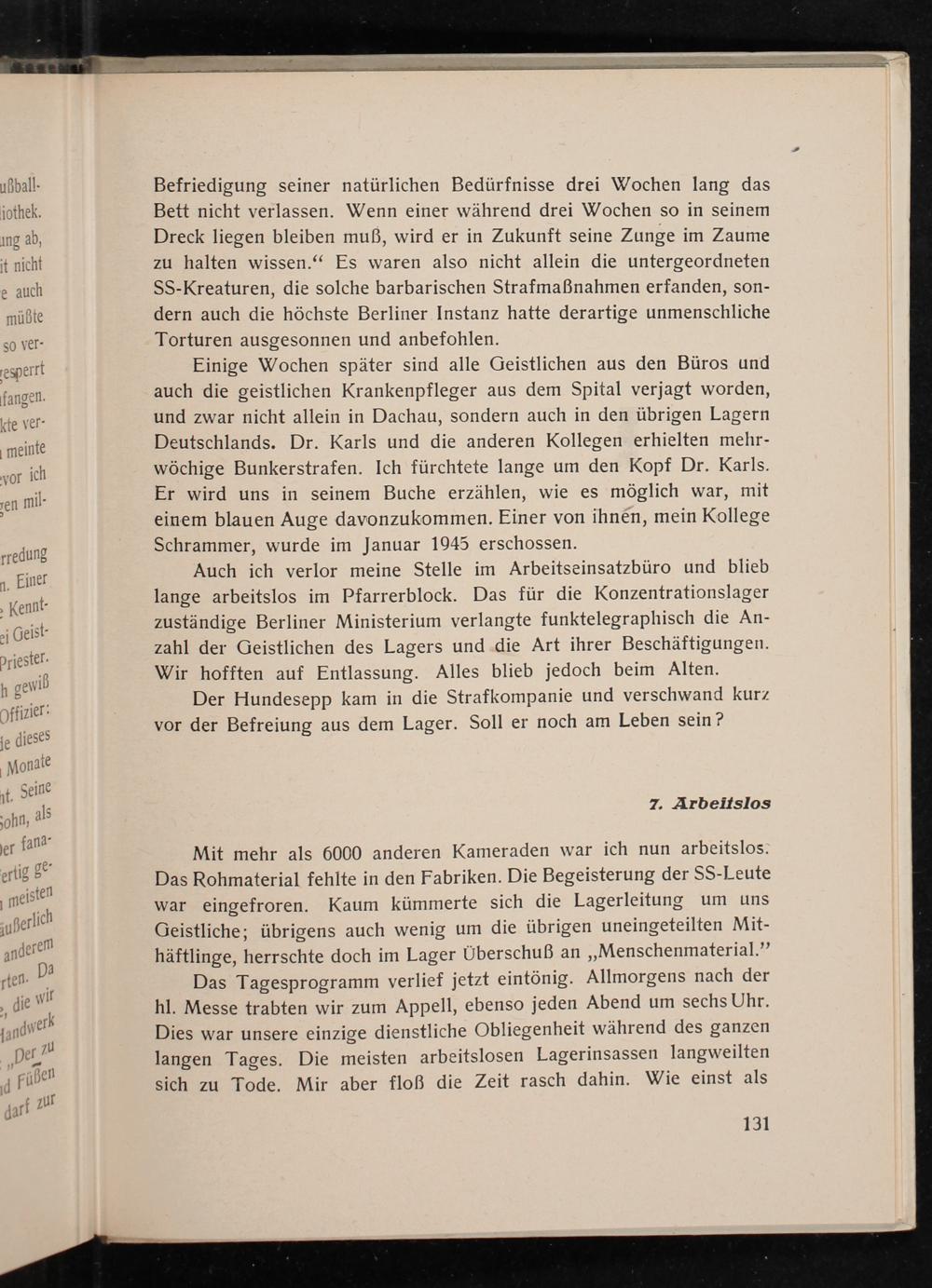 Einige Wochen später sind alle Geistlichen aus den Büros und auch die geistlichen Krankenpfleger aus dem Spital verjagt worden, und zwar nicht allein in Dachau , sondern auch in den übrigen Lagern Deutschlands . Dr. Karls und die anderen Kollegen erhielten mehrwöchige Bunkerstrafen. Ich fürchtete lange um den Kopf Dr. Karls. Er wird uns in seinem Buche erzählen, wie es möglich war, mit einem blauen Auge davonzukommen. Einer von ihnen, mein Kollege Schrammer, wurde im Januar 1945 erschossen.