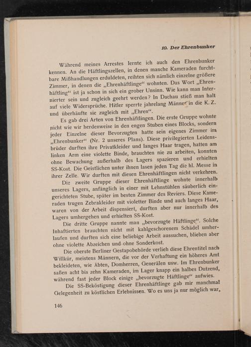 Es gab drei Arten von Ehrenhäftlingen. Die erste Gruppe wohnte nicht wie wir herdenweise in den engen Stuben eines Blocks, sondern jeder Einzelne dieser Bevorzugten hatte sein eigenes Zimmer im „Ehrenbunker‘‘(Nr. 2 unseres Plans). Diese privilegierten Leidens- brüder durften ihre Privatkleider und langes Haar tragen, hatten am linken Arm eine violette Binde, brauchten nie zu arbeiten, konnten ohne Bewachung außerhalb des Lagers spazieren und erhielten SS -Kost. Die Geistlichen unter ihnen lasen jeden Tag die hl. Messe in ihrer Zelle. Wir durften mit diesen Ehrenhäftlingen nicht verkehren.