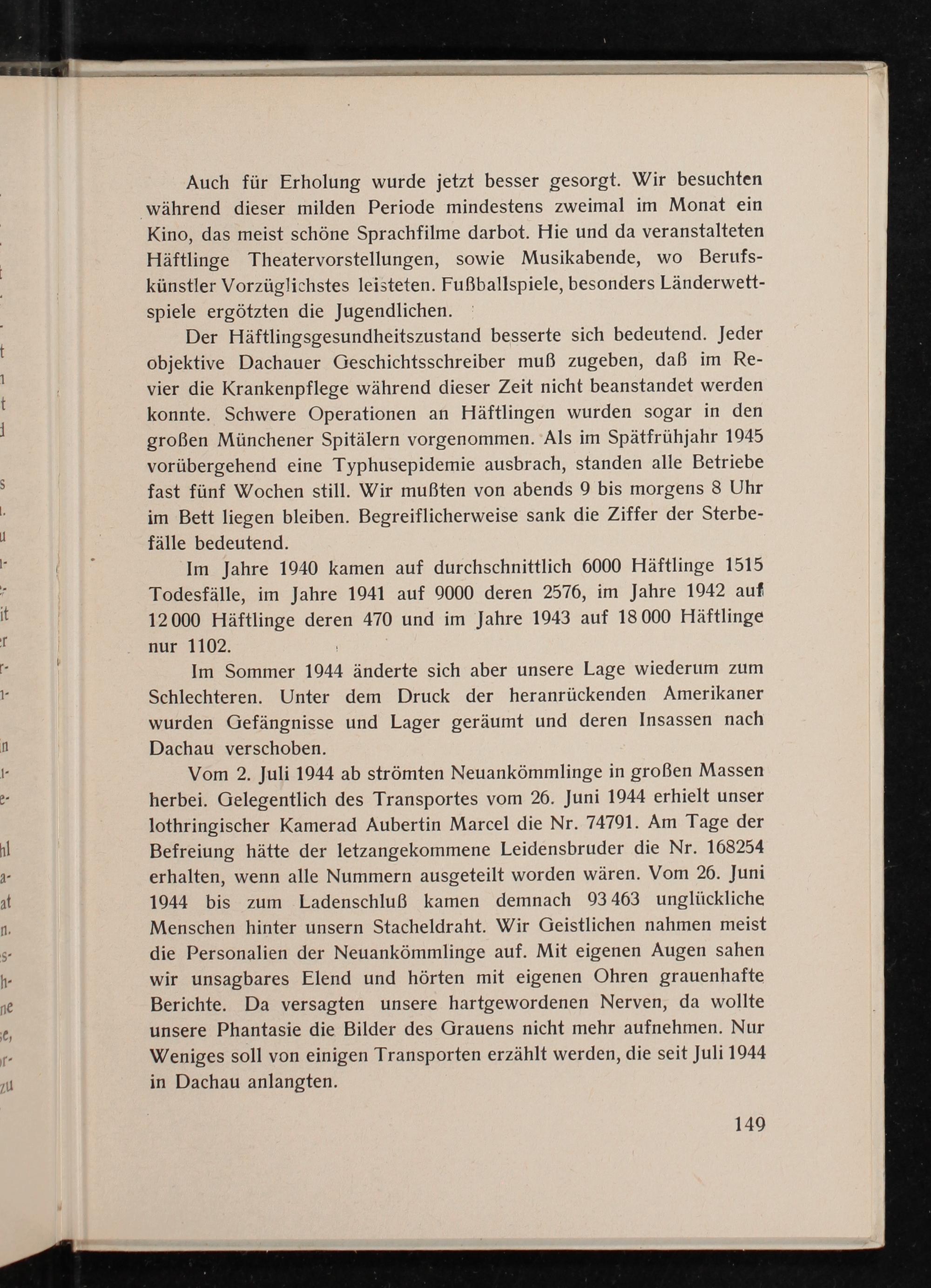 Der Häftlingsgesundheitszustand besserte sich bedeutend. Jeder objektive Dachauer Geschichtsschreiber muß zugeben, daß im Re- vier die Krankenpflege während dieser Zeit nicht beanstandet werden konnte. Schwere Operationen an Häftlingen wurden sogar in den großen Münchener Spitälern vorgenommen. Als im Spätfrühjahr 1945 vorübergehend eine Typhusepidemie ausbrach, standen alle Betriebe fast fünf Wochen still. Wir mußten von abends 9 bis morgens 3 Uhr im Bett liegen bleiben. Begreiflicherweise sank die Ziffer der Sterbe- fälle bedeutend.