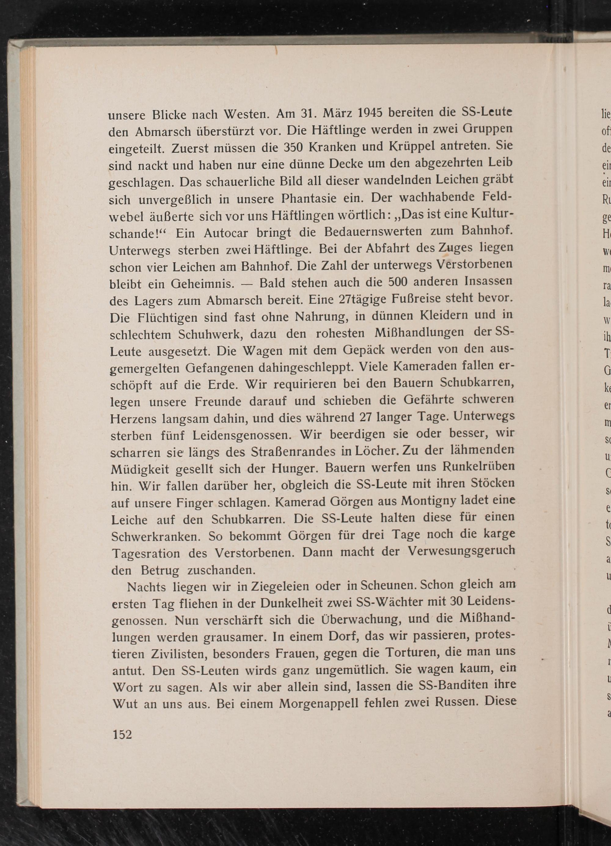 unsere Blicke nach Westen. Am 31. März 1945 bereiten die SS -Leute den Abmarsch überstürzt vor. Die Häftlinge werden in zwei Gruppen eingeteilt. Zuerst müssen die 350 Kranken und Krüppel antreten. Sie sind nackt und haben nur eine dünne Decke um den abgezehrten Leib geschlagen. Das schauerliche Bild all dieser wandelnden Leichen gräbt sich unvergeßlich in unsere Phantasie ein. Der wachhabende Feld- webel äußerte sich vor uns Häftlingen wörtlich:„Das ist eine Kultur- schande!“ Ein Autocar bringt die Bedauernswerten zum Bahnhof. Unterwegs sterben zwei Häftlinge. Bei der Abfahrt des Zuges liegen schon vier Leichen am Bahnhof. Die Zahl der unterwegs Verstorbenen bleibt ein Geheimnis.— Bald stehen auch die 500 anderen Insassen des Lagers zum Abmarsch bereit. Eine 27tägige Fußreise steht bevor. Die Flüchtigen sind fast ohne Nahrung, in dünnen Kleidern und in schlechtem Schuhwerk, dazu den rohesten Mißhandlungen der SS - Leute ausgesetzt. Die Wagen mit dem Gepäck werden von den aus- gemergelten Gefangenen dahingeschleppt. Viele Kameraden fallen er- schöpft auf die Erde. Wir requirieren bei den Bauern Schubkarren, legen unsere Freunde darauf und schieben die Gefährte schweren Herzens langsam dahin, und dies während 27 langer Tage. Unterwegs sterben fünf Leidensgenossen. Wir beerdigen sie oder besser, wir scharren sie längs des Straßenrandes in Löcher. Zu der lähmenden Müdigkeit gesellt sich der Hunger. Bauern werfen uns Runkelrüben hin. Wir fallen darüber her, obgleich die SS -Leute mit ihren Stöcken auf unsere Finger schlagen. Kamerad Görgen aus Montigny ladet eine Leiche auf den Schubkarren. Die SS -Leute halten diese für einen Schwerkranken. So bekommt Görgen für drei Tage noch die karge Tagesration des Verstorbenen. Dann macht der Verwesungsgeruch den Betrug zuschanden.