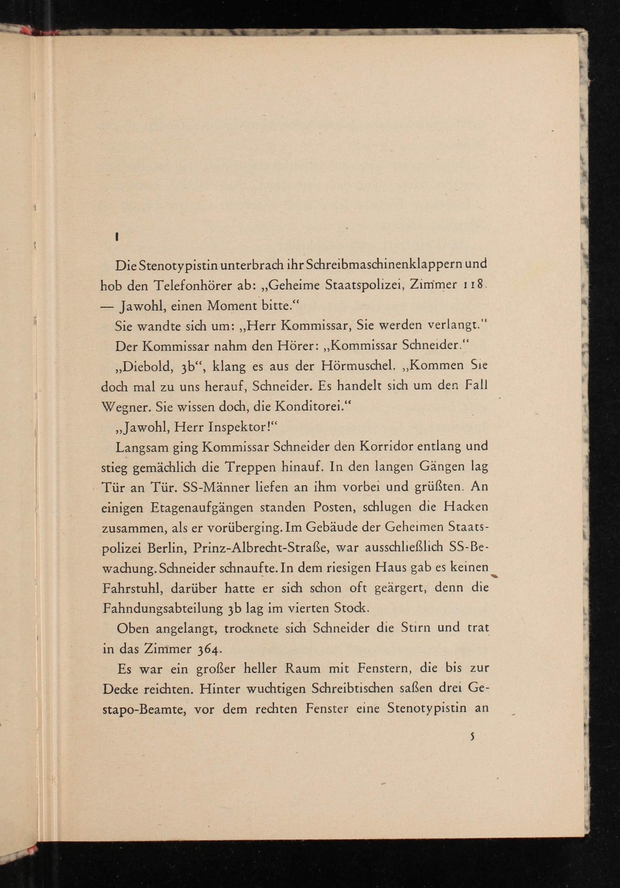 Die Stenotypistin unterbrach ihr Schreibmaschinenklappern und hob den Telefonhörer ab: ,, Geheime Staatspolizei , Zimmer 118. - Jawohl, einen Moment bitte."