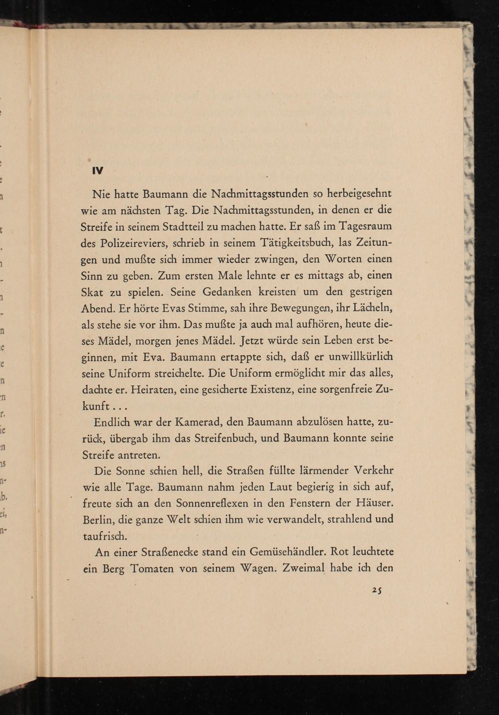 Nie hatte Baumann die Nachmittagsstunden so herbeigesehnt wie am nächsten Tag. Die Nachmittagsstunden, in denen er die Streife in seinem Stadtteil zu machen hatte. Er saß im Tagesraum des Polizeireviers, schrieb in seinem Tätigkeitsbuch, las Zeitungen und mußte sich immer wieder zwingen, den Worten einen Sinn zu geben. Zum ersten Male lehnte er es mittags ab, einen Skat zu spielen. Seine Gedanken kreisten um den gestrigen Abend. Er hörte Evas Stimme, sah ihre Bewegungen, ihr Lächeln, als stehe sie vor ihm. Das mußte ja auch mal aufhören, heute dieses Mädel, morgen jenes Mädel. Jetzt würde sein Leben erst beginnen, mit Eva. Baumann ertappte sich, daß er unwillkürlich seine Uniform streichelte. Die Uniform ermöglicht mir das alles, dachte er. Heiraten, eine gesicherte Existenz, eine sorgenfreie Zukunft...