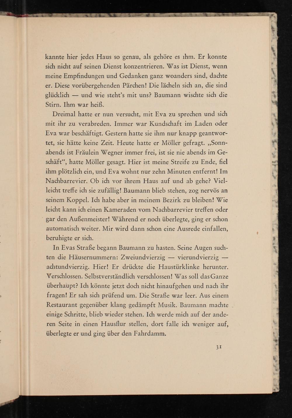 Dreimal hatte er nun versucht, mit Eva zu sprechen und sich mit ihr zu verabreden. Immer war Kundschaft im Laden oder Eva war beschäftigt. Gestern hatte sie ihm nur knapp geantwortet, sie hätte keine Zeit. Heute hatte er Möller gefragt. ,, Sonnabends ist Fräulein Wegner immer frei, ist sie nie abends im Geschäft", hatte Möller gesagt. Hier ist meine Streife zu Ende, fiel ihm plötzlich ein, und Eva wohnt nur zehn Minuten entfernt! Im Nachbarrevier. Ob ich vor ihrem Haus auf und ab gehe? Vielleicht treffe ich sie zufällig! Baumann blieb stehen, zog nervös an seinem Koppel. Ich habe aber in meinem Bezirk zu bleiben! Wie leicht kann ich einen Kameraden vom Nachbarrevier treffen oder gar den Außenmeister! Während er noch überlegte, ging er schon automatisch weiter. Mir wird dann schon eine Ausrede einfallen, beruhigte er sich.