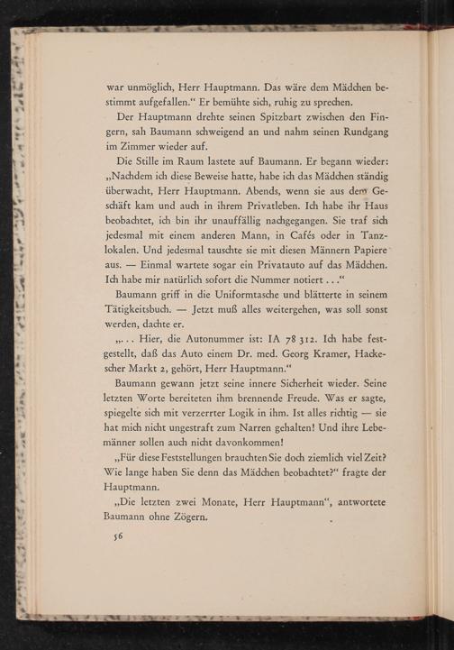Die Stille im Raum lastete auf Baumann. Er begann wieder: ,, Nachdem ich diese Beweise hatte, habe ich das Mädchen ständig überwacht, Herr Hauptmann. Abends, wenn sie aus dem Geschäft kam und auch in ihrem Privatleben. Ich habe ihr Haus beobachtet, ich bin ihr unauffällig nachgegangen. Sie traf sich jedesmal mit einem anderen Mann, in Cafés oder in Tanzlokalen. Und jedesmal tauschte sie mit diesen Männern Papiere Einmal wartete sogar ein Privatauto auf das Mädchen. Ich habe mir natürlich sofort die Nummer notiert..."