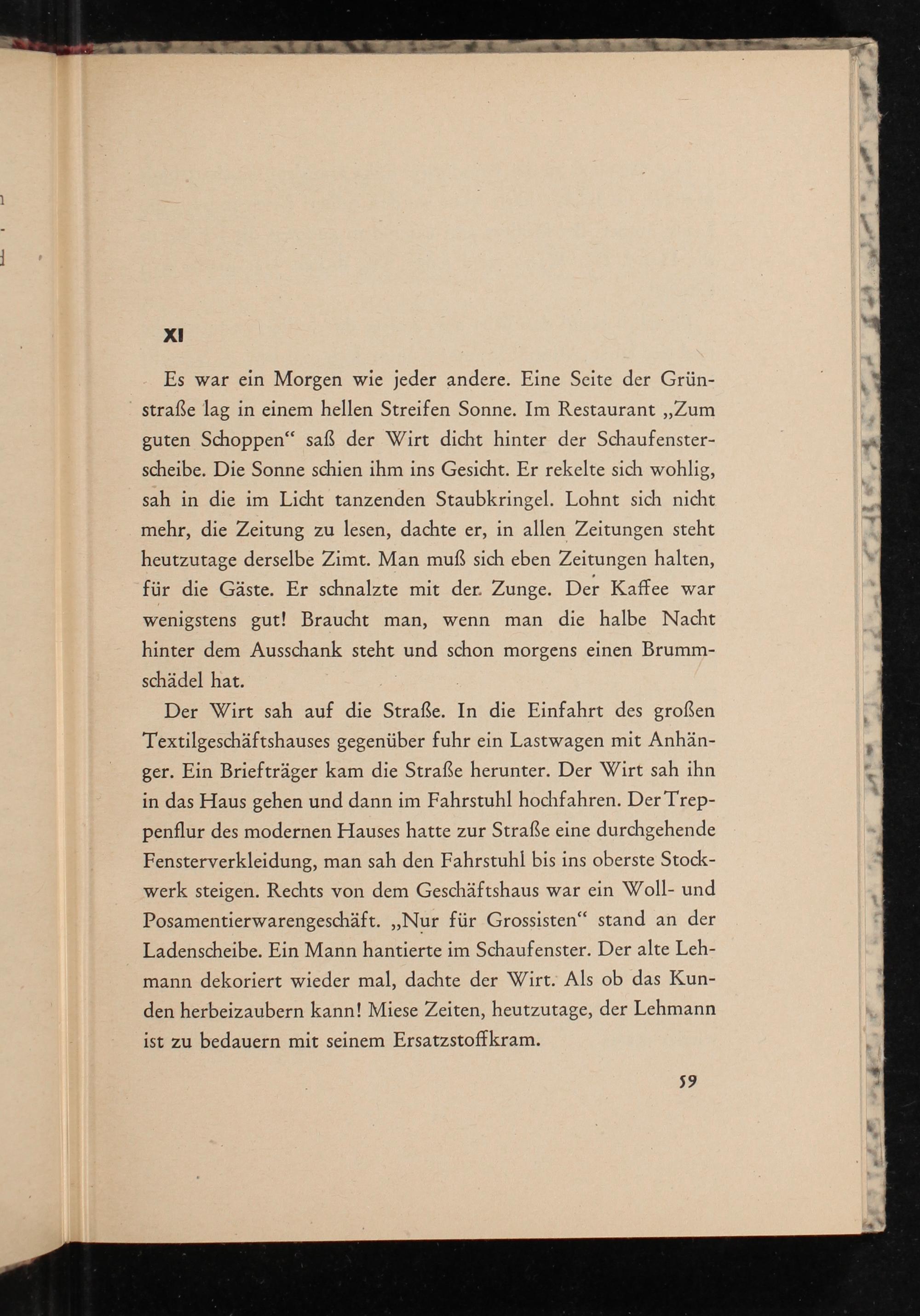 Der Wirt sah auf die Straße. In die Einfahrt des großen Textilgeschäftshauses gegenüber fuhr ein Lastwagen mit Anhänger. Ein Briefträger kam die Straße herunter. Der Wirt sah ihn in das Haus gehen und dann im Fahrstuhl hochfahren. Der Treppenflur des modernen Hauses hatte zur Straße eine durchgehende Fensterverkleidung, man sah den Fahrstuhl bis ins oberste Stockwerk steigen. Rechts von dem Geschäftshaus war ein Woll- und Posamentierwarengeschäft. ,, Nur für Grossisten" stand an der Ladenscheibe. Ein Mann hantierte im Schaufenster. Der alte Lehmann dekoriert wieder mal, dachte der Wirt. Als ob das Kunden herbeizaubern kann! Miese Zeiten, heutzutage, der Lehmann ist zu bedauern mit seinem Ersatzstoffkram.