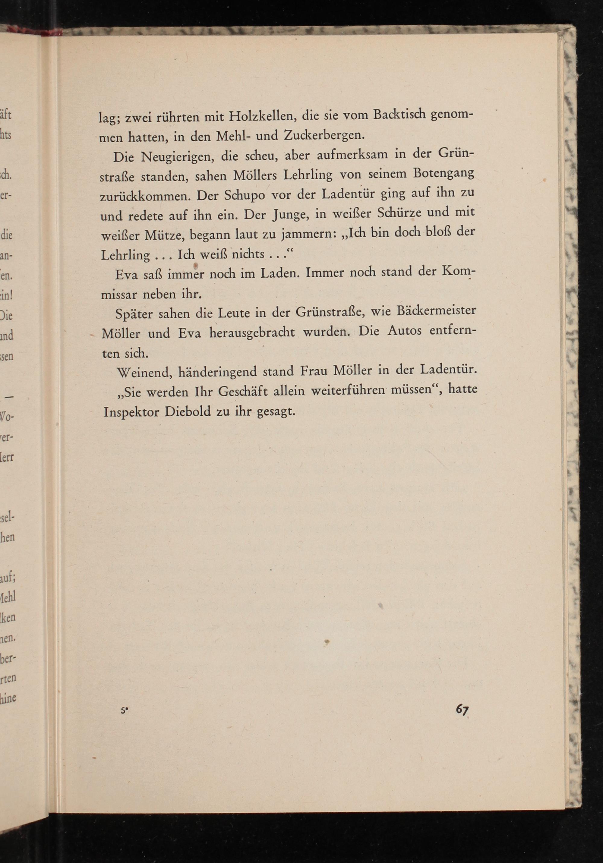 und redete auf ihn ein. Der Junge, in weißer Schürze und mit die weißer Mütze, begann laut zu jammern:„Ich bin doch bloß der an- Lehrling... Ich weiß nichts...“ en. Eva saß immer noch im Laden. Immer noch stand der Kom- in! missar neben ihr. die Später sahen die Leute in der Grünstraße, wie Bäckermeister ınd Möller und Eva herausgebracht wurden. Die Autos entfern- sen ten sich.