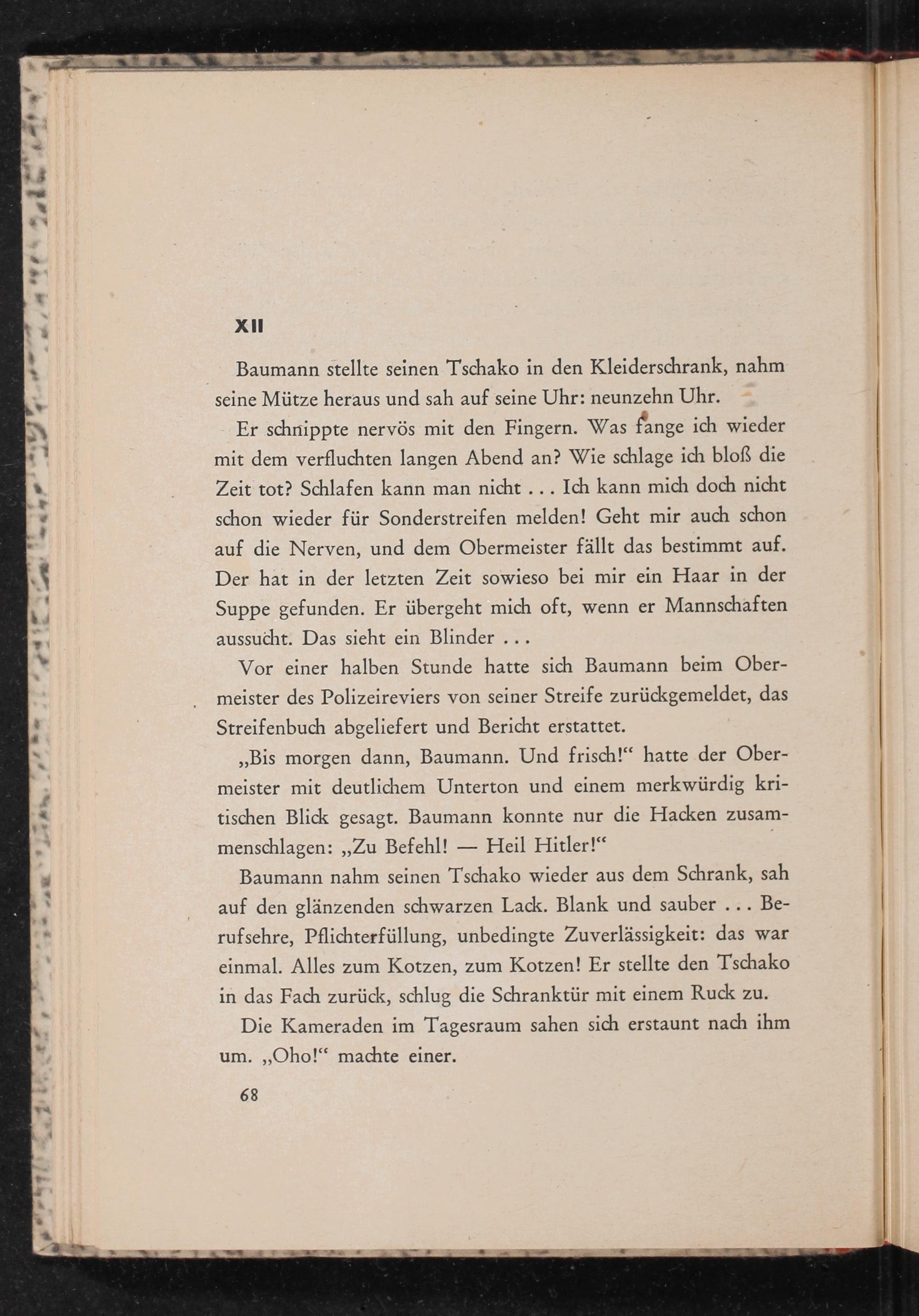 Baumann nahm seinen Tschako wieder aus dem Schrank, sah auf den glänzenden schwarzen Lack. Blank und sauber... Berufsehre, Pflichterfüllung, unbedingte Zuverlässigkeit: das war einmal. Alles zum Kotzen, zum Kotzen! Er stellte den Tschako in das Fach zurück, schlug die Schranktür mit einem Ruck zu. Die Kameraden im Tagesraum sahen sich erstaunt nach ihm um. ,, Oho!" machte einer.