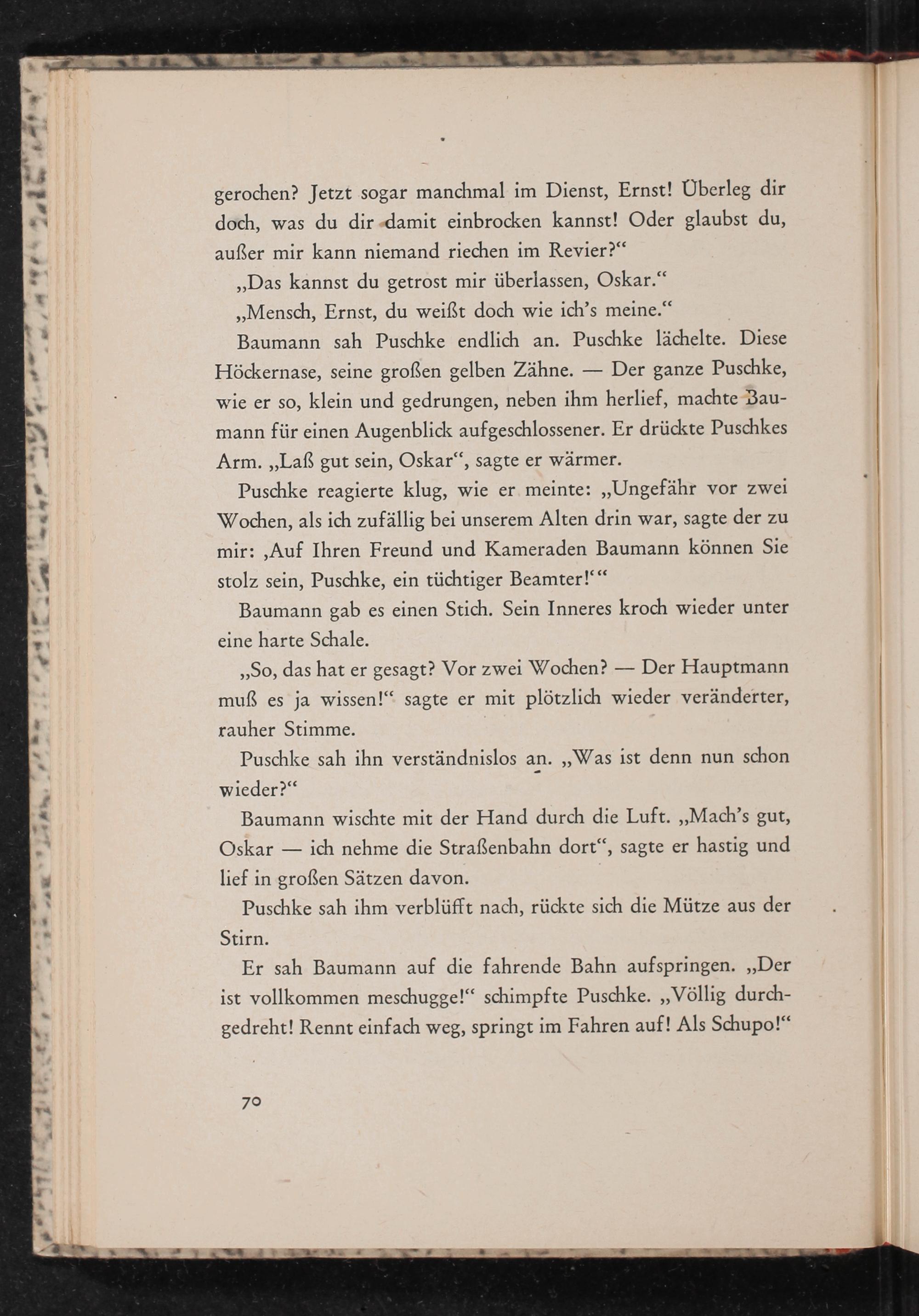 Er sah Baumann auf die fahrende Bahn aufspringen. ,, Der ist vollkommen meschugge!" schimpfte Puschke. ,, Völlig durchgedreht! Rennt einfach weg, springt im Fahren auf! Als Schupo!"