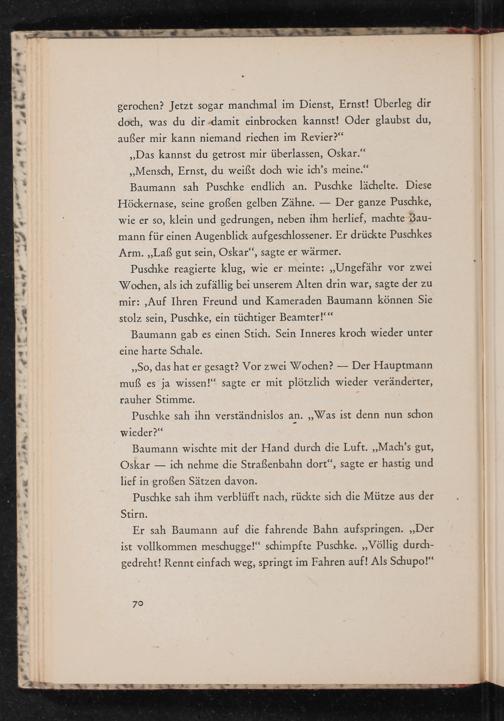 Baumann sah Puschke endlich an. Puschke lächelte. Diese Höckernase, seine großen gelben Zähne. - Der ganze Puschke, wie er so, klein und gedrungen, neben ihm herlief, machte Baumann für einen Augenblick aufgeschlossener. Er drückte Puschkes Arm. ,, Laß gut sein, Oskar", sagte er wärmer.