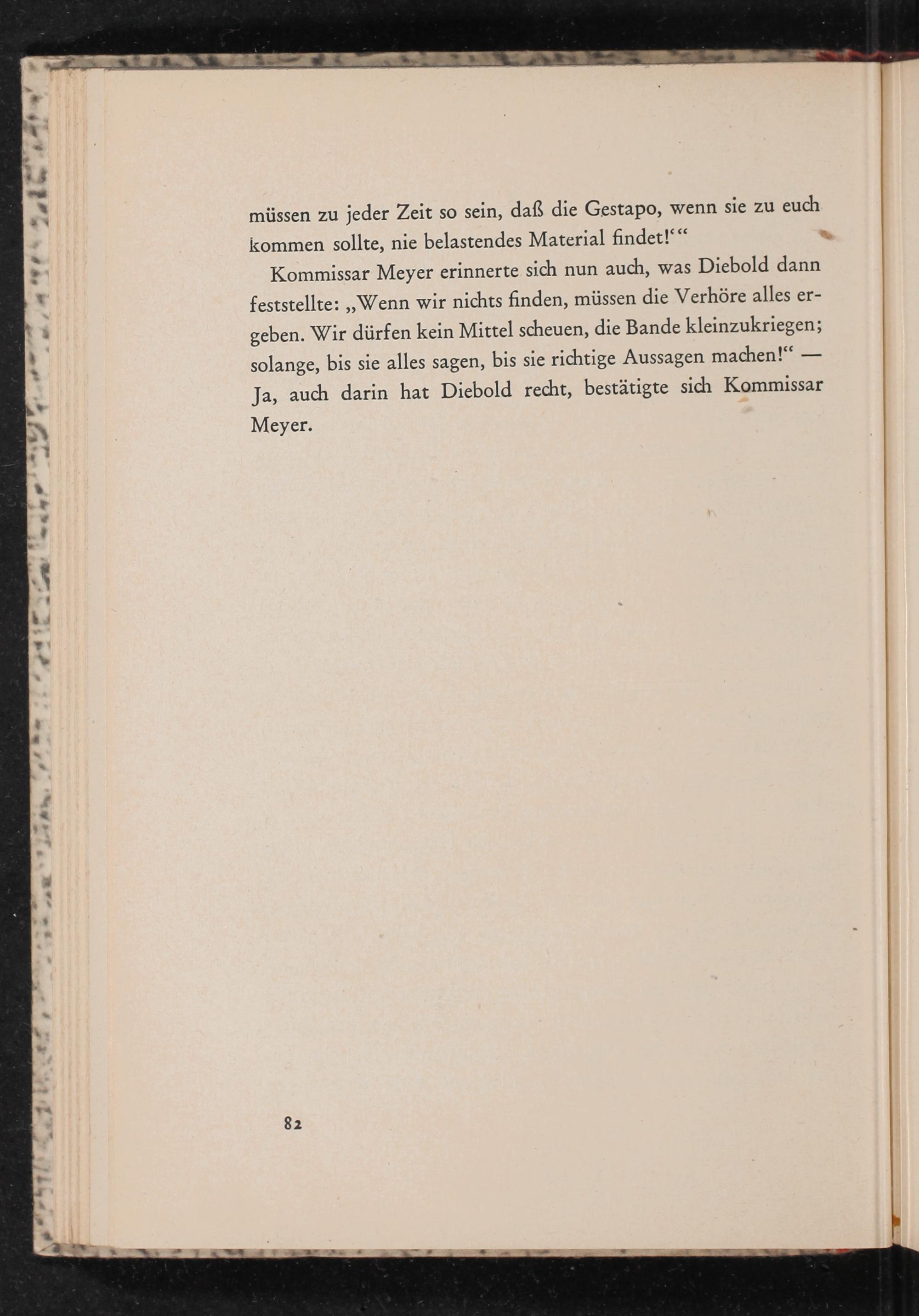 Kommissar Meyer erinnerte sich nun auch, was Diebold dann feststellte: ,, Wenn wir nichts finden, müssen die Verhöre alles ergeben. Wir dürfen kein Mittel scheuen, die Bande kleinzukriegen; solange, bis sie alles sagen, bis sie richtige Aussagen machen!" Ja, auch darin hat Diebold recht, bestätigte sich Kommissar Meyer.